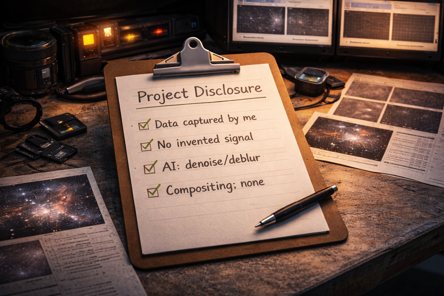 - Cosmetic fixes allowed: satellite trails, hot pixels, dust motes, mild artifact cleanup — provided they don’t invent an astronomical signal.