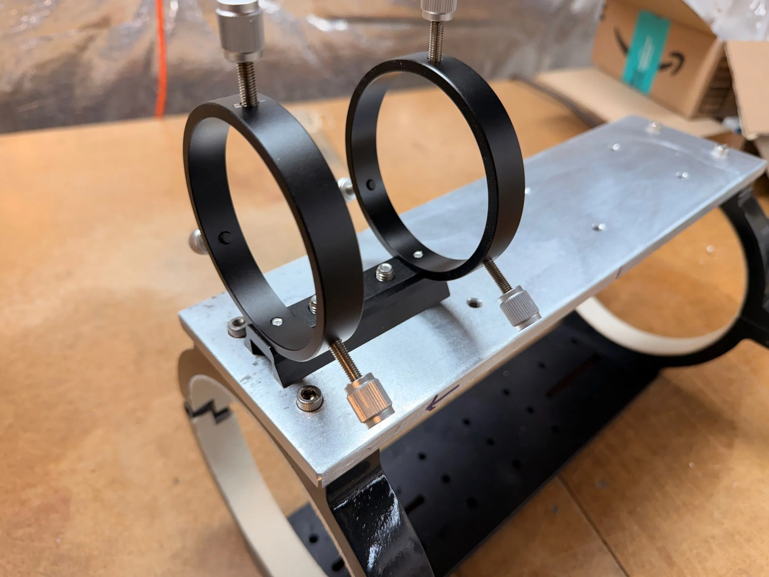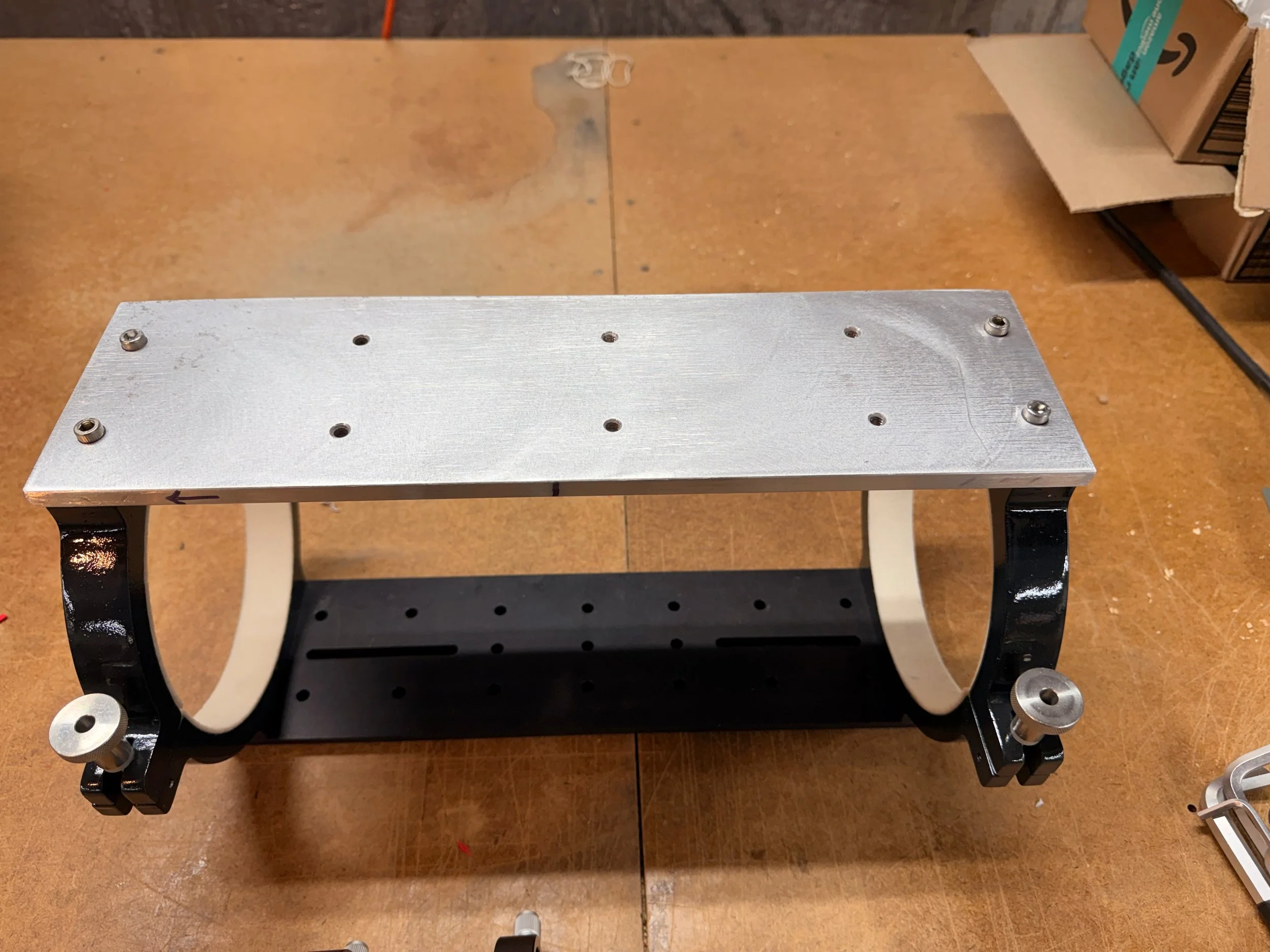 The original cradle had a Losmandy dovetail bottom plate, rings, an aluminum plate on top, and another Losmandy dovetail plate screwed onto it. The top plate was not really needed, so I removed it. This saved almost 2lbs.