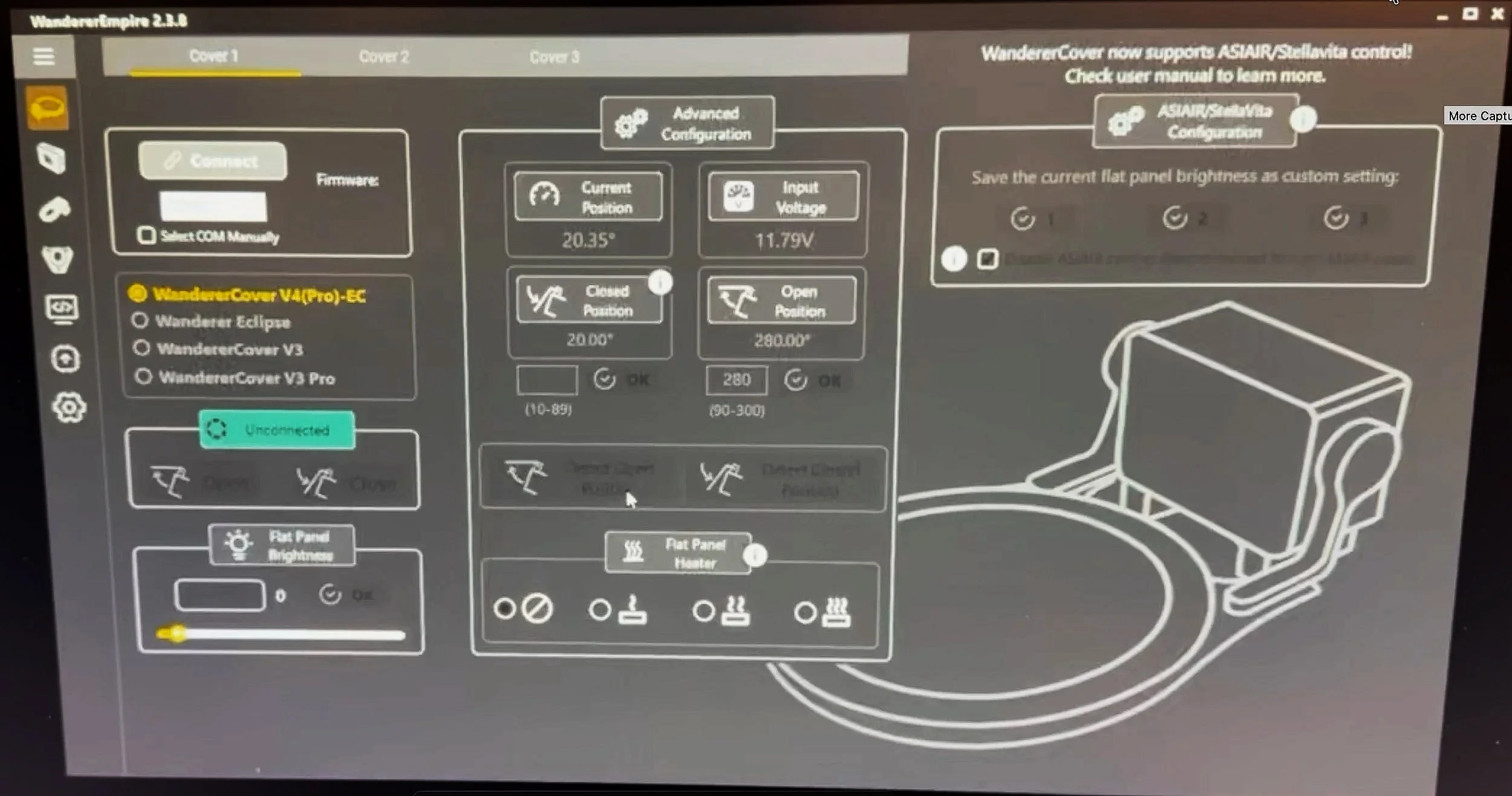 After loading the WandererEmpire software, I connected to the cover and set the open and close angles.