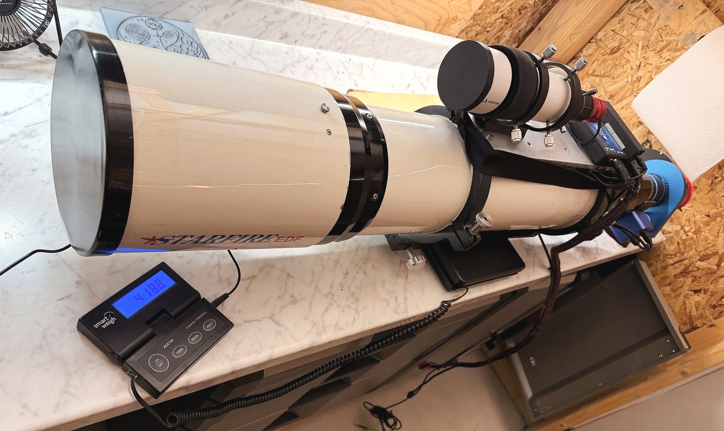 The old OTA weighed in at 42.8 lbs. The new OTA was coming in at 41.8 lbs. The motorized cover weighed 0.9 lbs, so that the new one would weigh almost exactly the same!