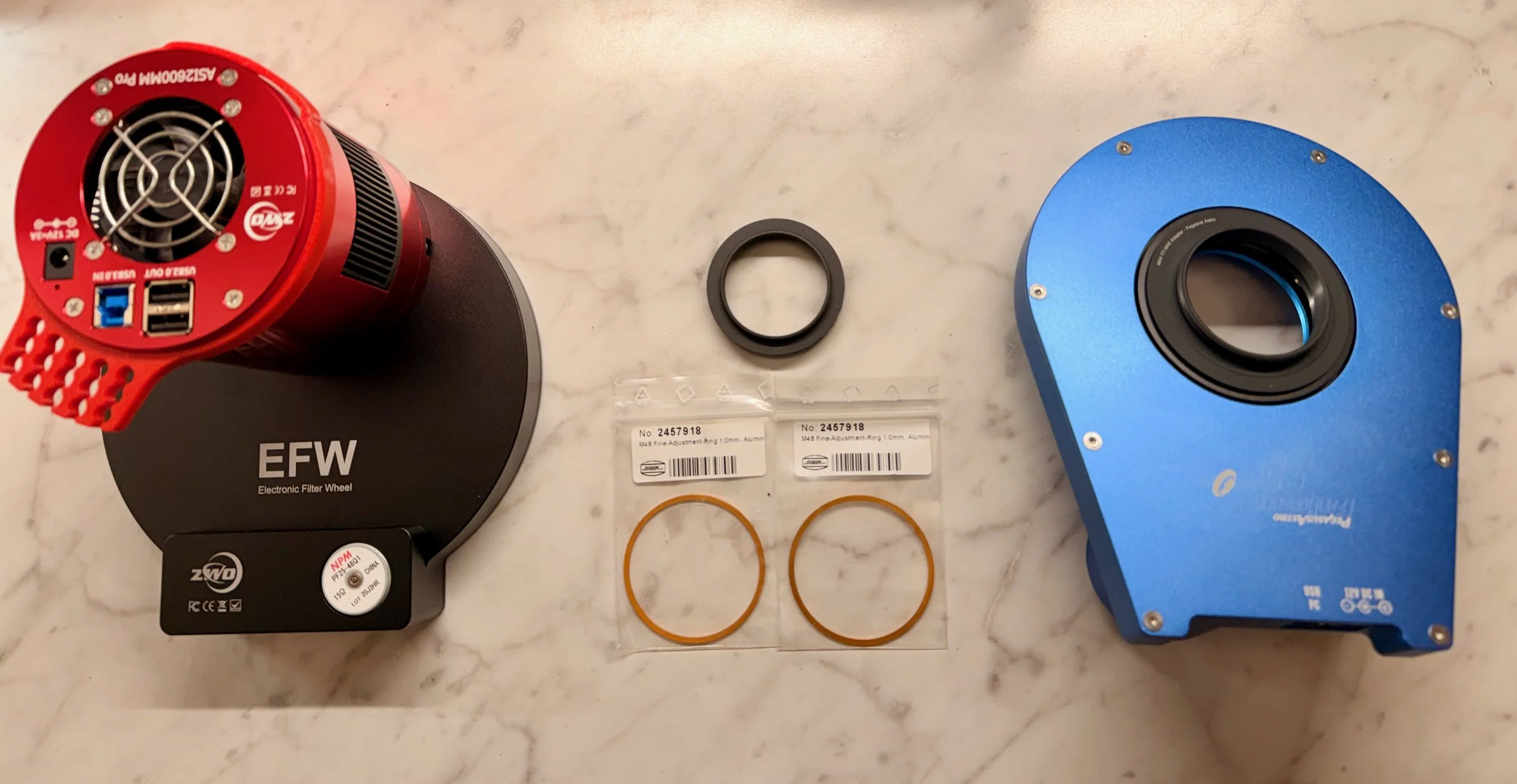 To recreate this stack, I needed to attach the EFW to the Rotator with a 10mm spacer. I was able to get a 42mm-to-48mm adapter, but this had a 7mm thickness, not 10mm. So I added three 1mm spacer rings to fill this out. Below are the parts used (while I only show two 1mm spacers here, I did use three)