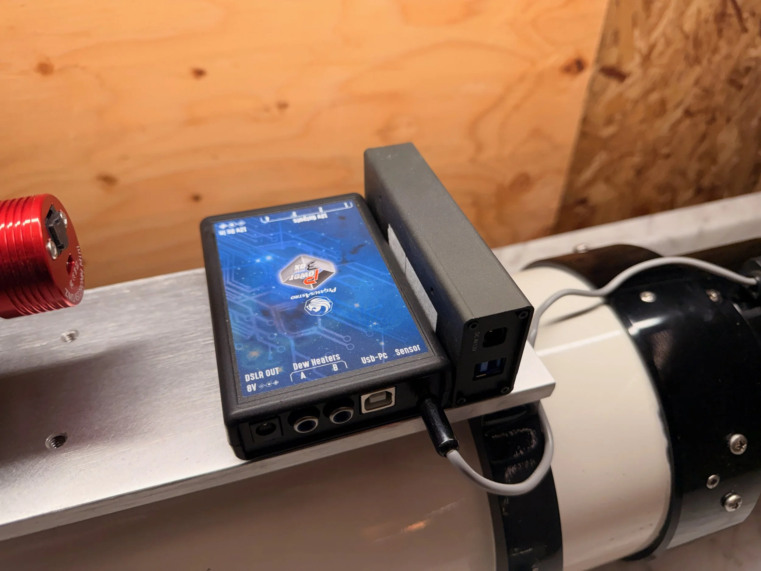 I chose to mount it on the side so that nothing made the scope “taller.” I use the white Cable-Wraps to mount it onto the scope, and then quickly plug in the 12v power supply wire and the USB cable. Fortunately, I had an extra USB port and an unused 12v plug on my Powerbox.