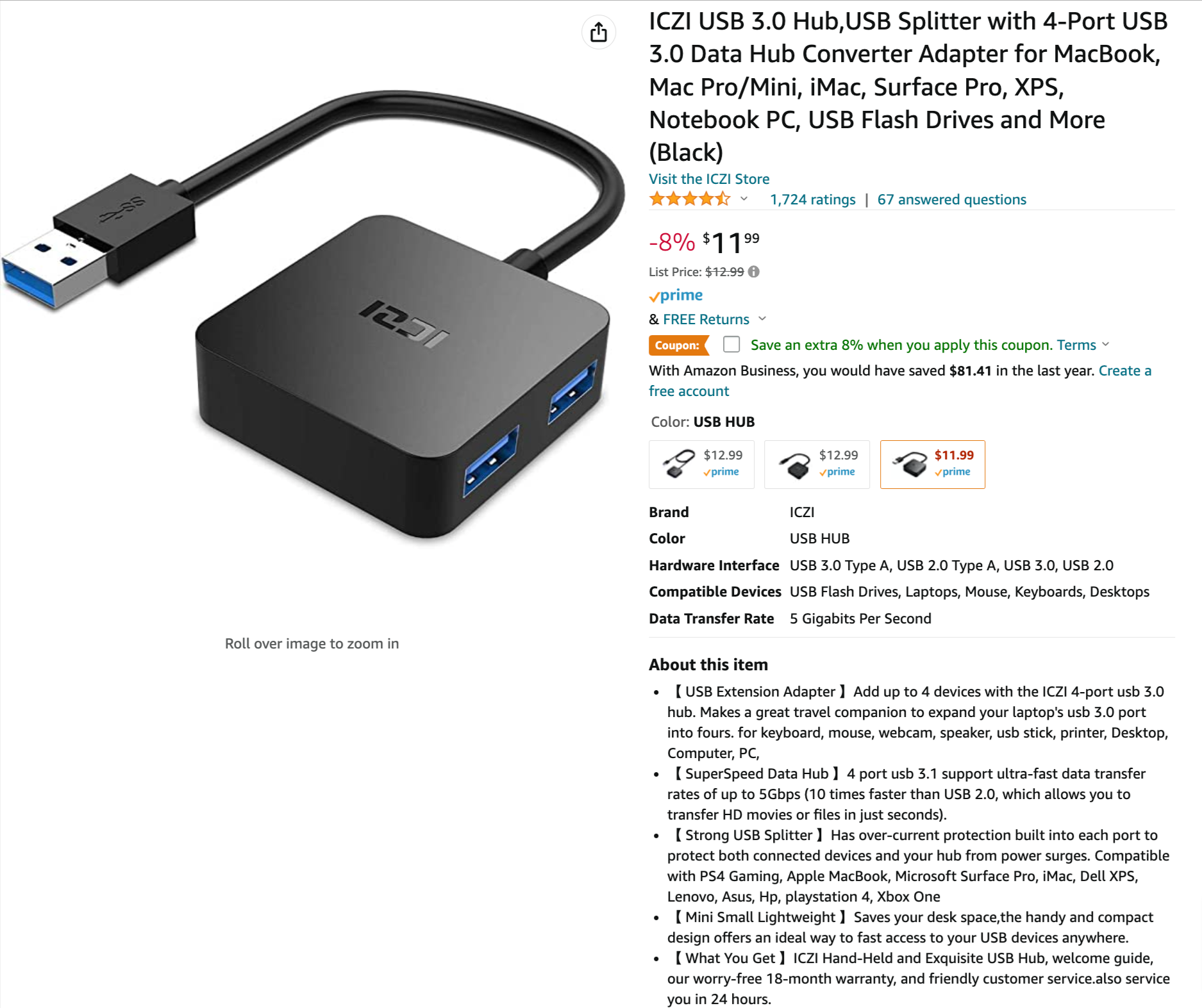 The small USB hub that I used to support the extra USB connection. This was small, light, and worked perfectly!