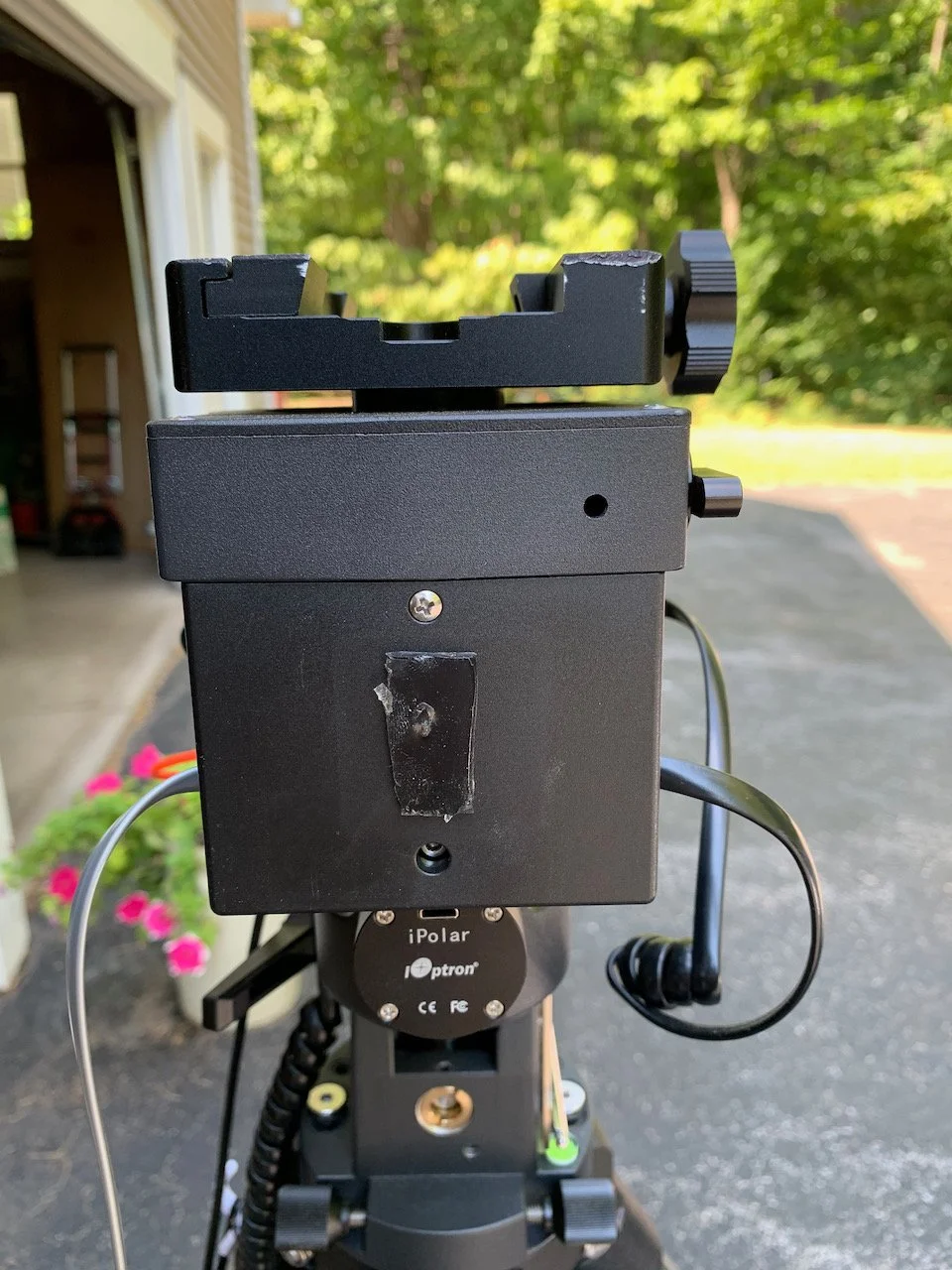 So I stripped the OTA off of the mount and then positioned things so I could better see the panel that covered the declination drive belt and motor. I removed the screw and the Allen bolt, and this allowed the cover to be removed
