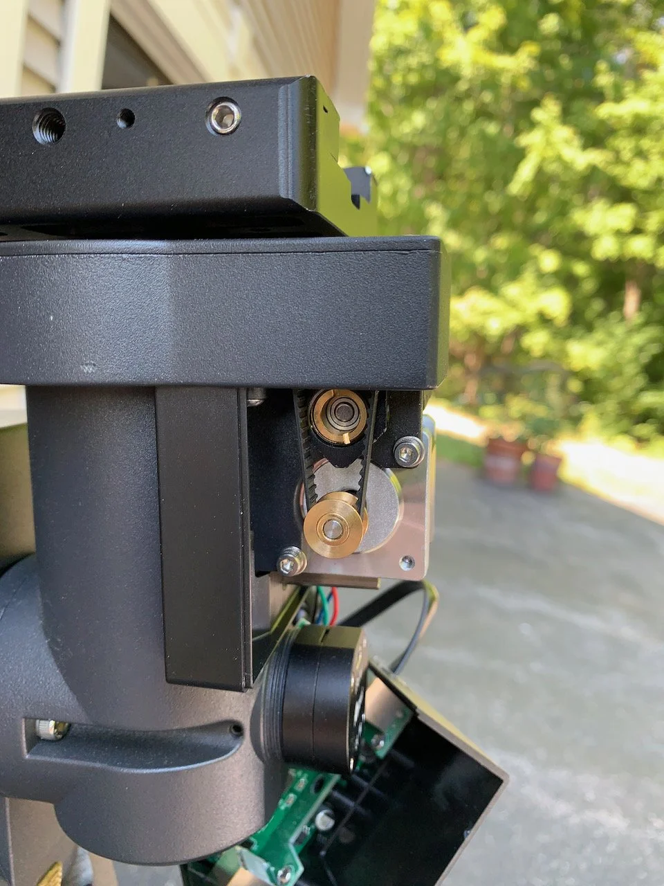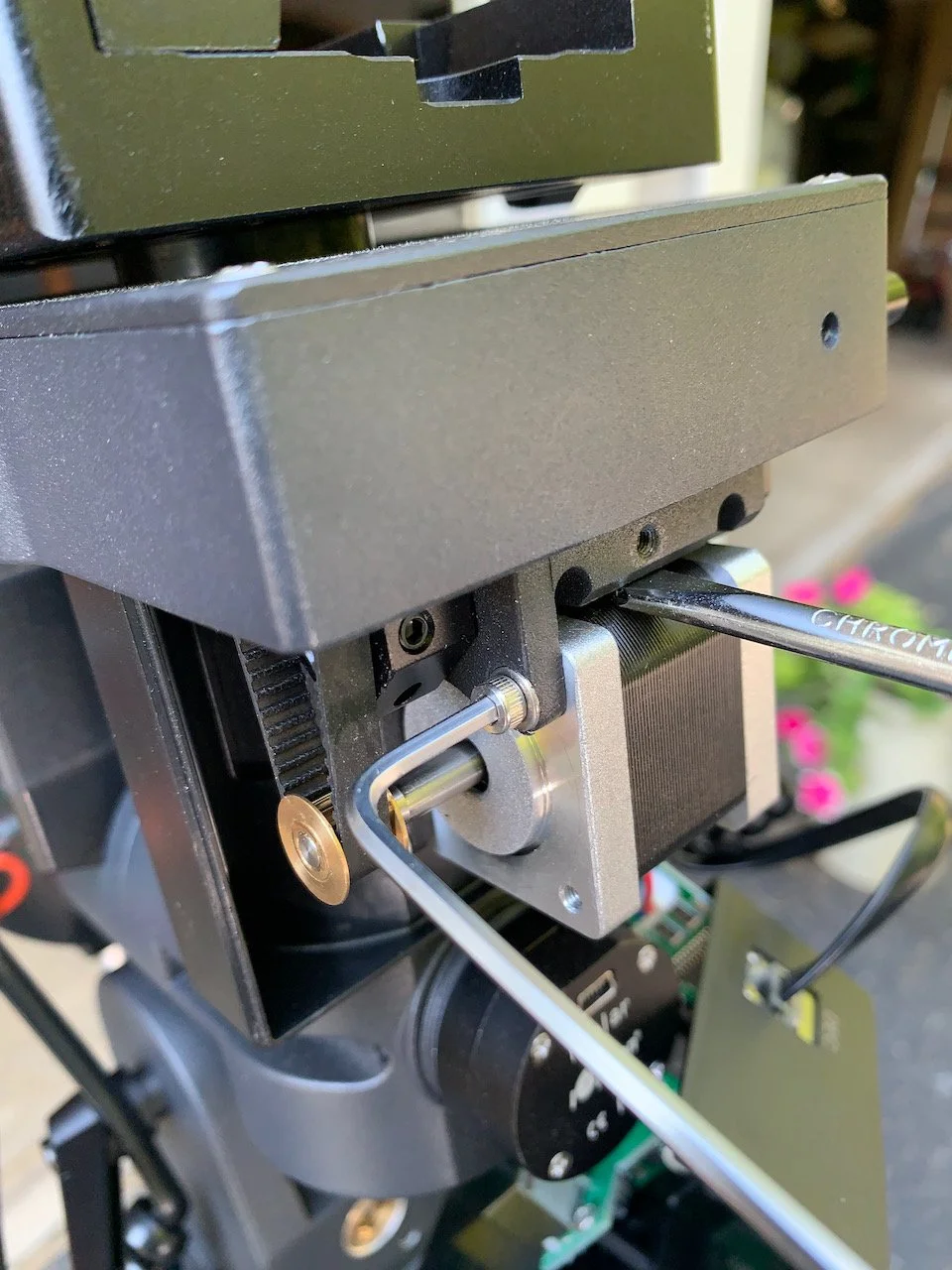 I then loosened the two screws on the motor mount, levered the motor down with a screwdriver to increase the belt tension, and then tightened things up. This should have done the trick - but I will not know until the next clear night!