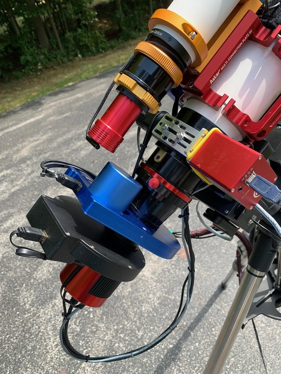 The new configuration! The Falcon Camera Rotor can be seen in blue at the back - mounted just in front of the Filter Wheel. Note the small square USB hub I added to support the extra USB connection needed.