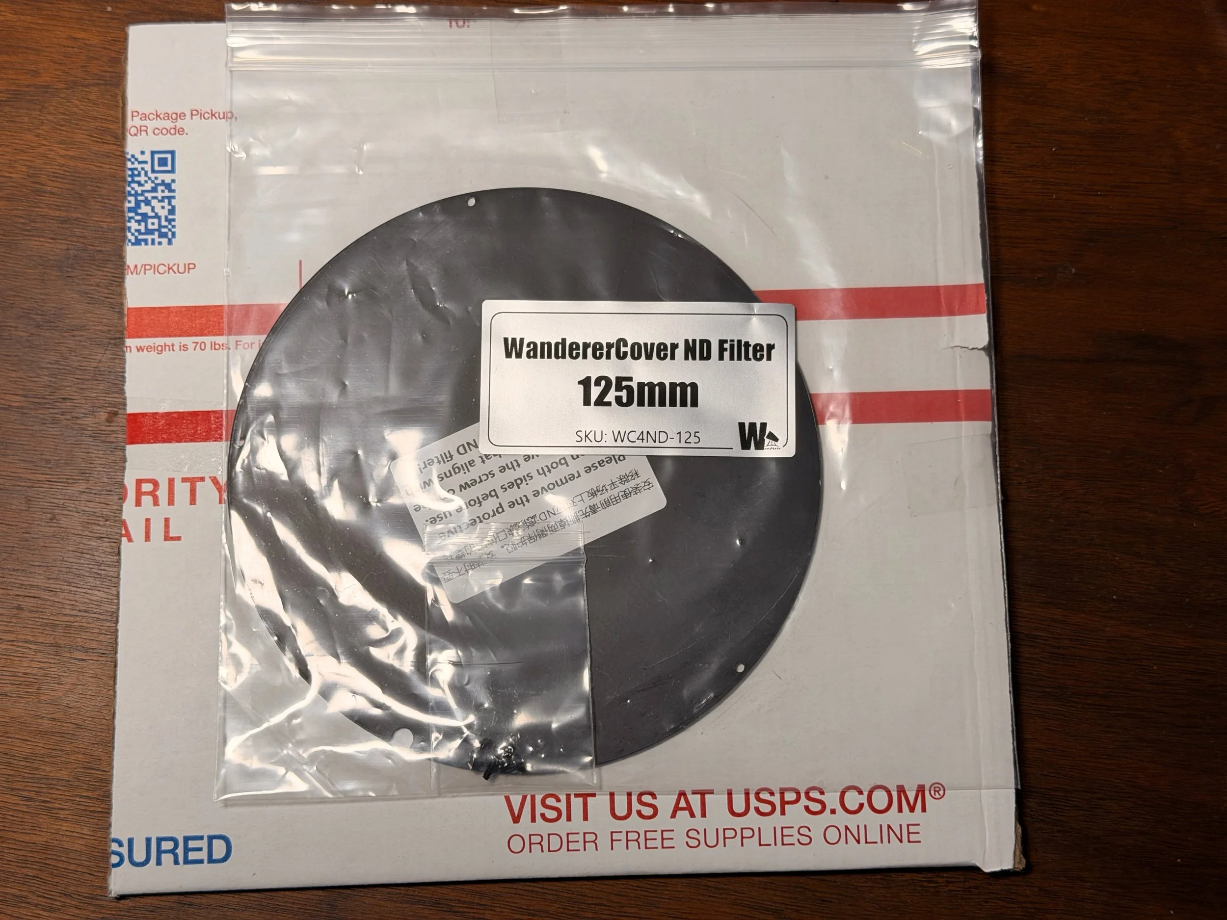 Subsequent testing suggested that the lowest brightness level was still too bright for this fast f/5.6 system. Fortunately, I had ordered the optional ND filter for the 125mm cover. This costs about $7 at Agena Astro and indicates that it increases exposure times by 32X. This would be a 5-stop decrease in light and an optical density of 1.50.