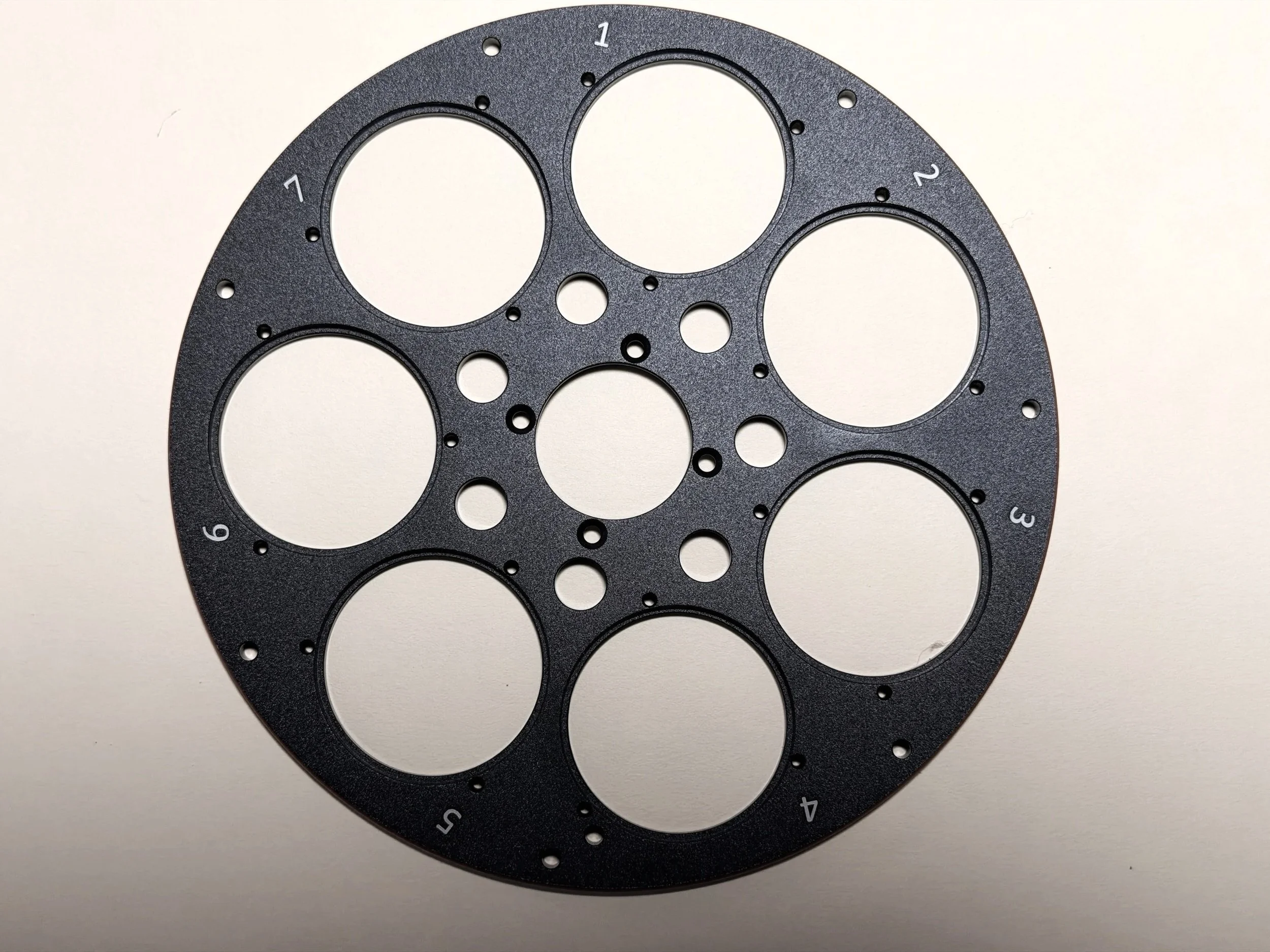 The outer set of holes are needed for bolting to the camera. I removed the plugs and now you can see 3 screws mounting the EFW and so you can see the filter aperture. (click to enlarge)