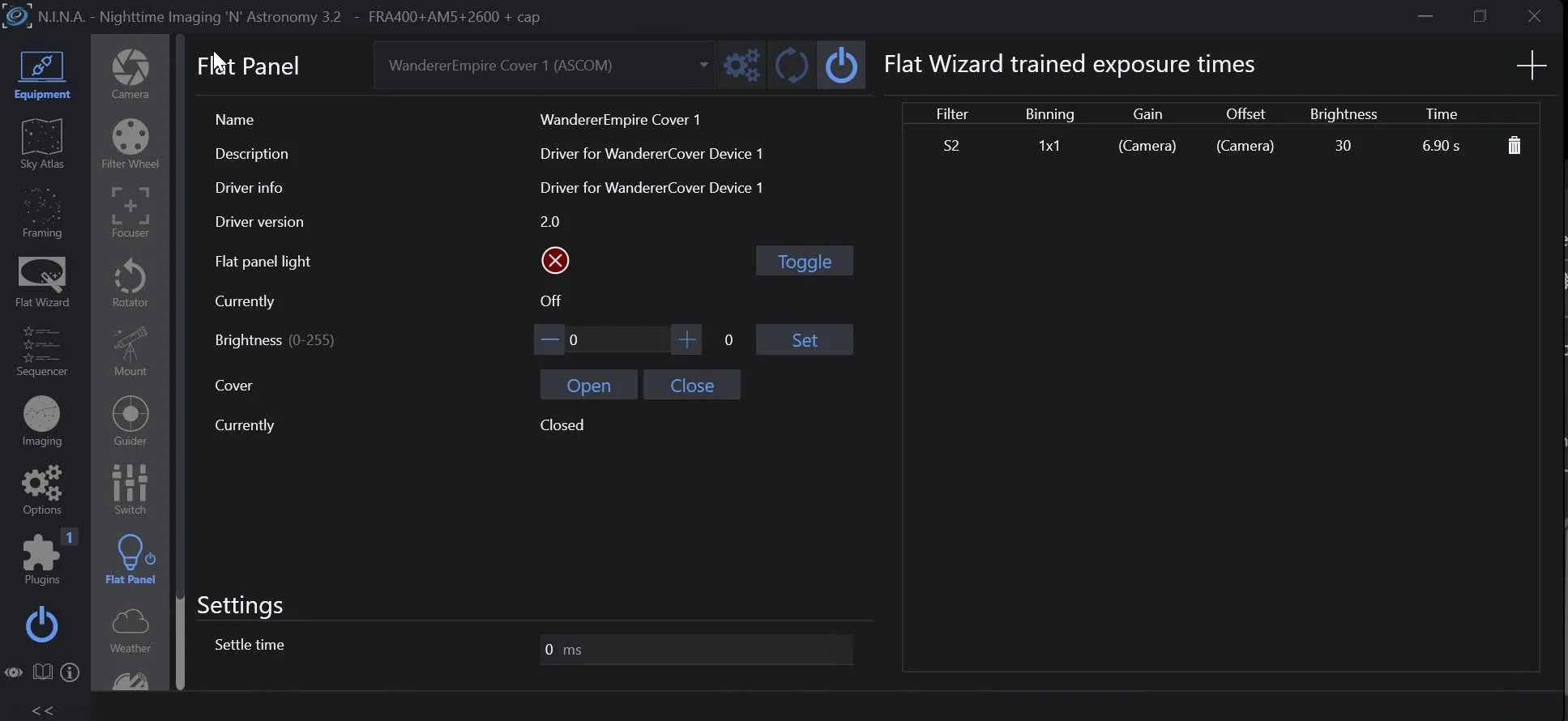 Connecting the Flat Device in NINA exposes the controls available for use from within that environment.