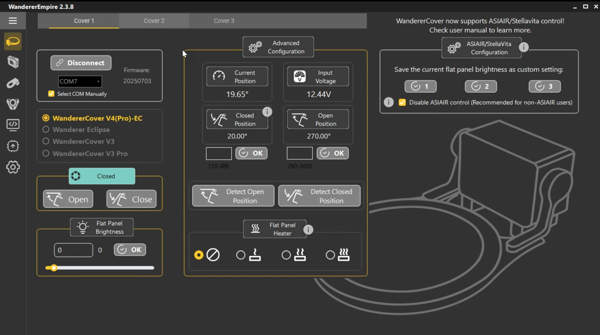 WandererEmpire is the main driver software for all Wanderer Products and has a pretty intuitive interface. You can use this to connect to the cover and control it.