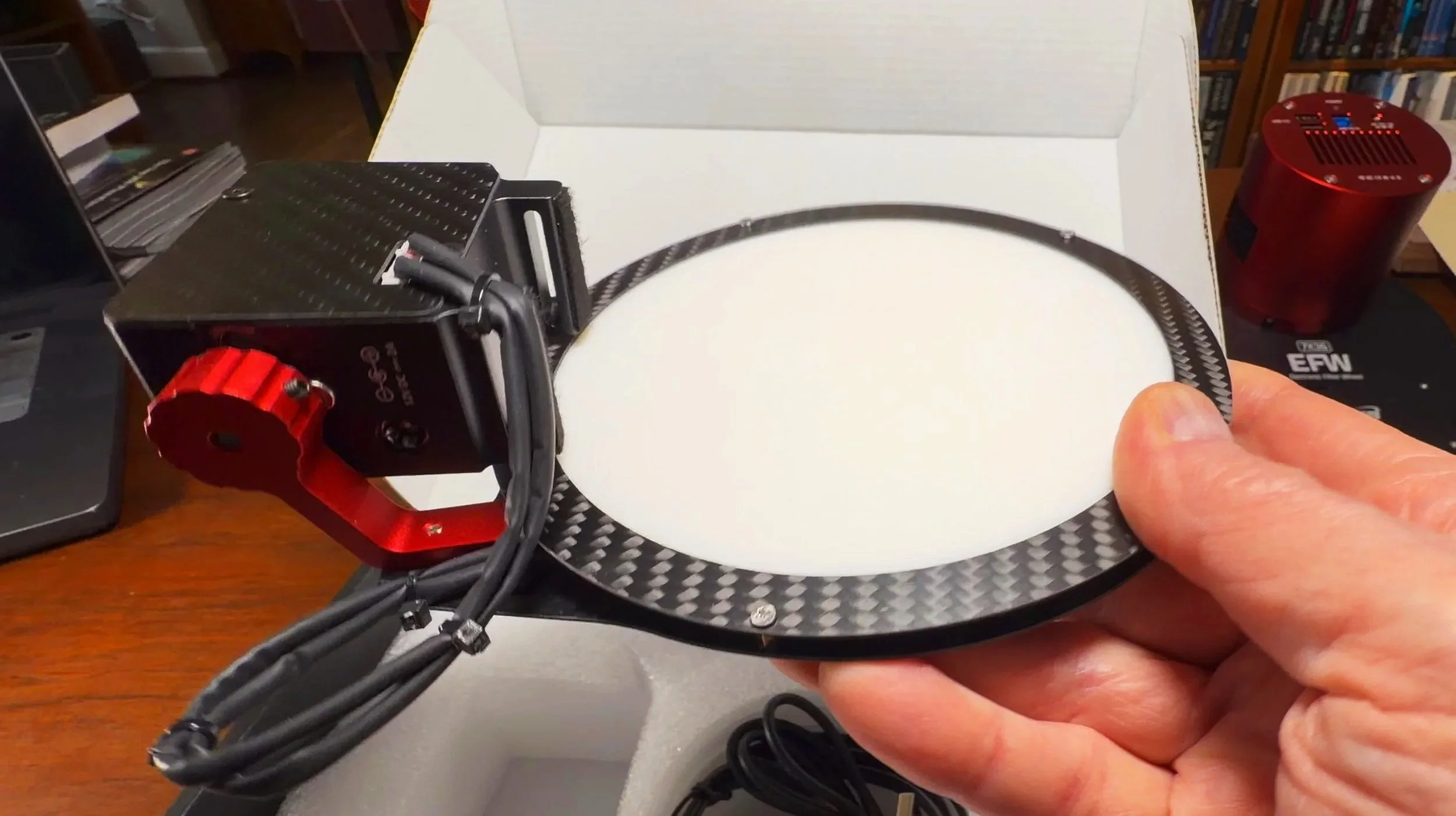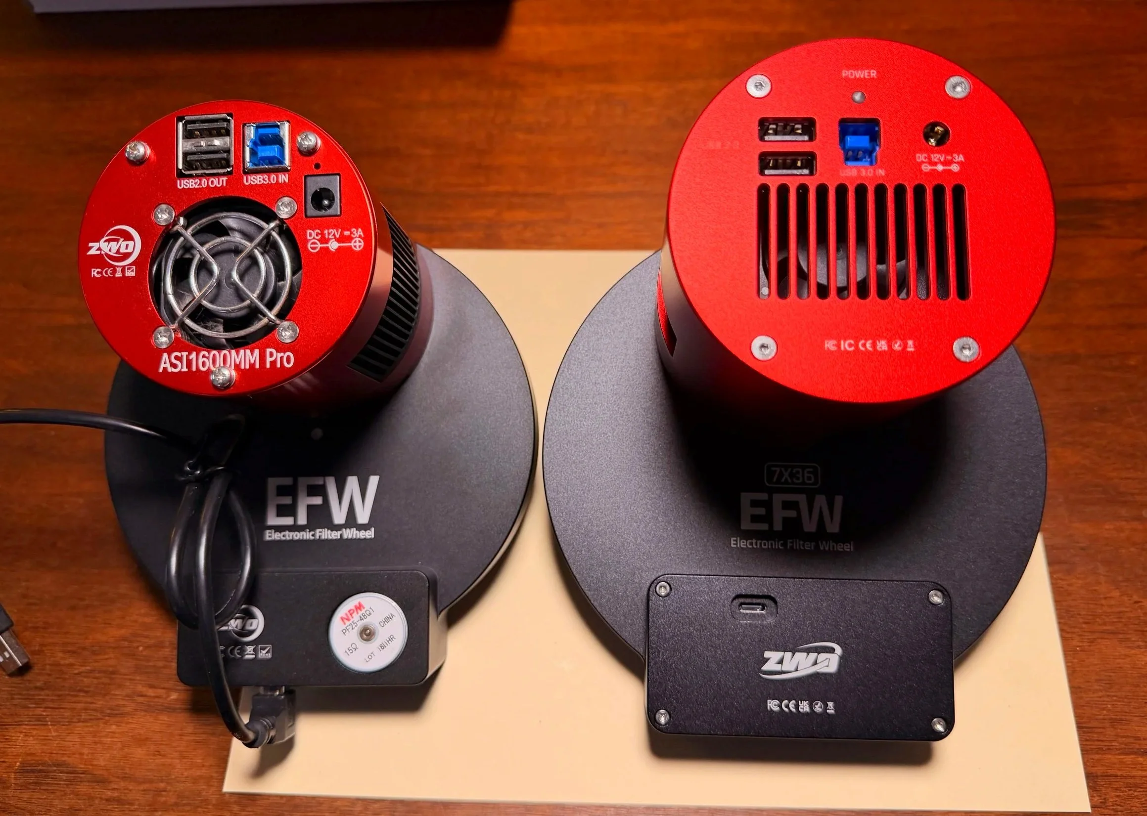 The new camera is much larger than the old one! Note the USB—C plug on the new EFW. Moving this from the outer edge to here will solve the problem of cable snags between the EFW and my Falcon Camera Rotator!