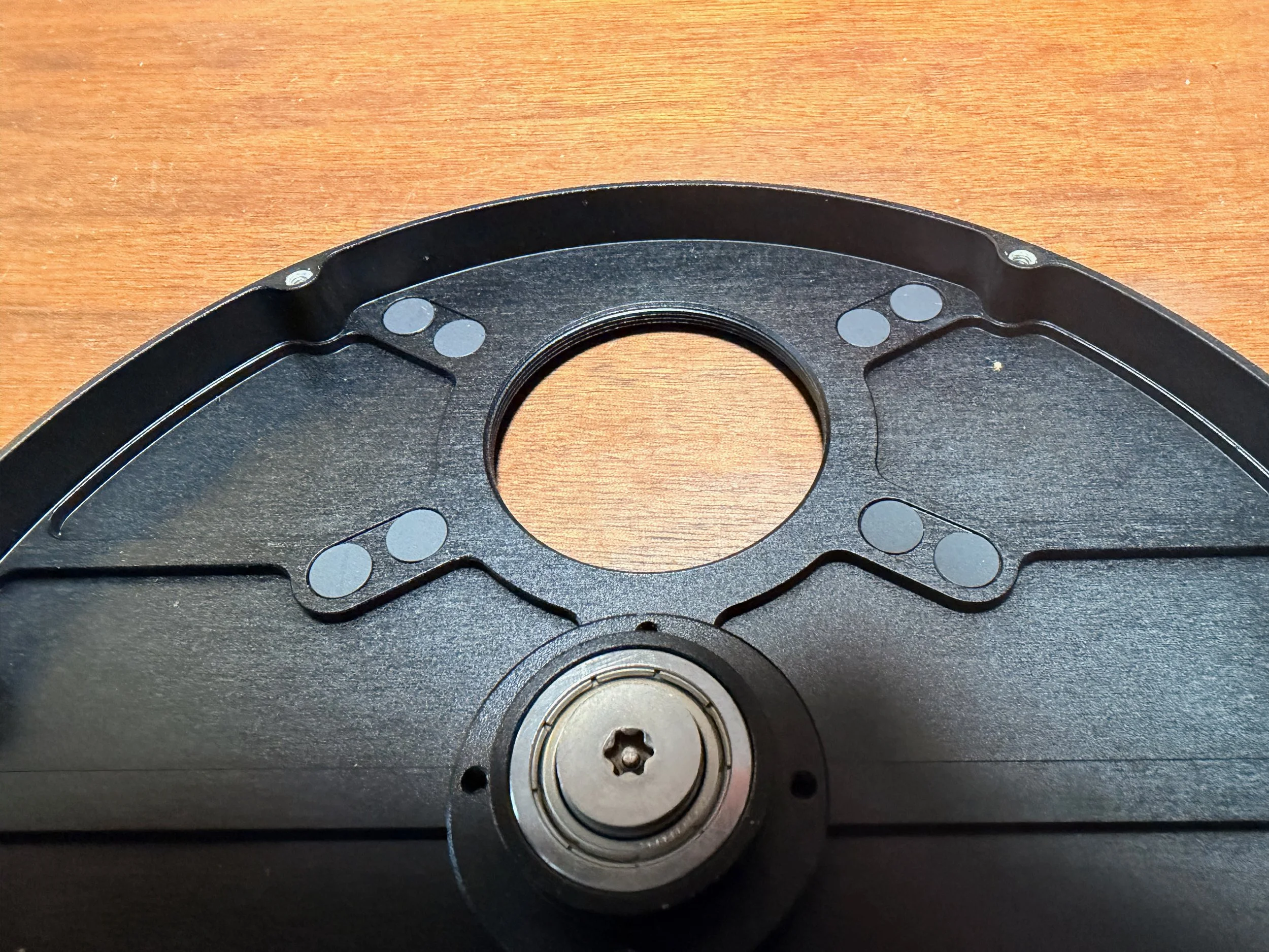 The four screws holding the wheel in are removed and we can now see the two sets of four mounting holes. These are covered by light-blocking plugs.