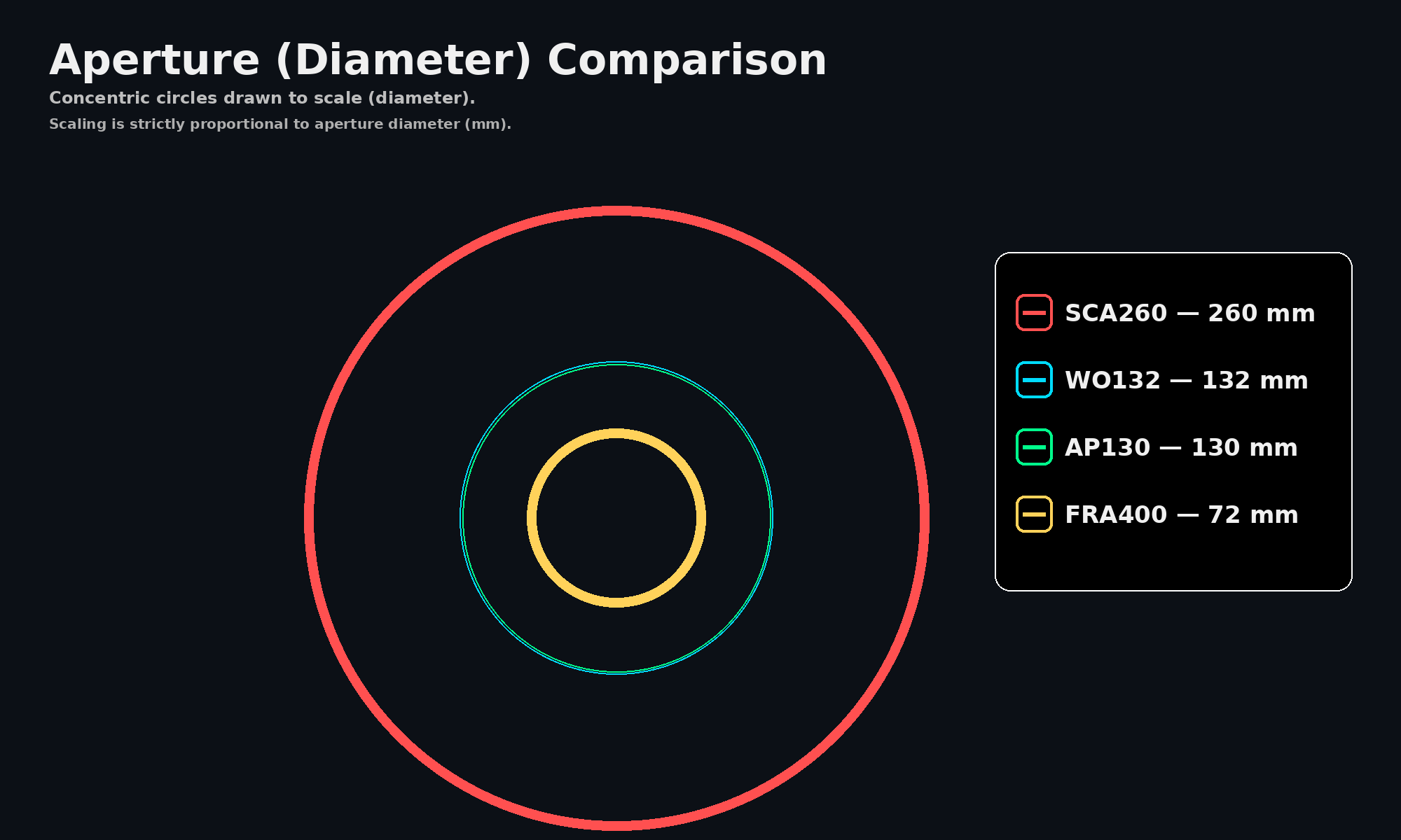 The SCA260 is in a different league on raw light-gathering—about 13× the capture area of the FRA400—which is exactly why it dominates the small-target and “reach” work.