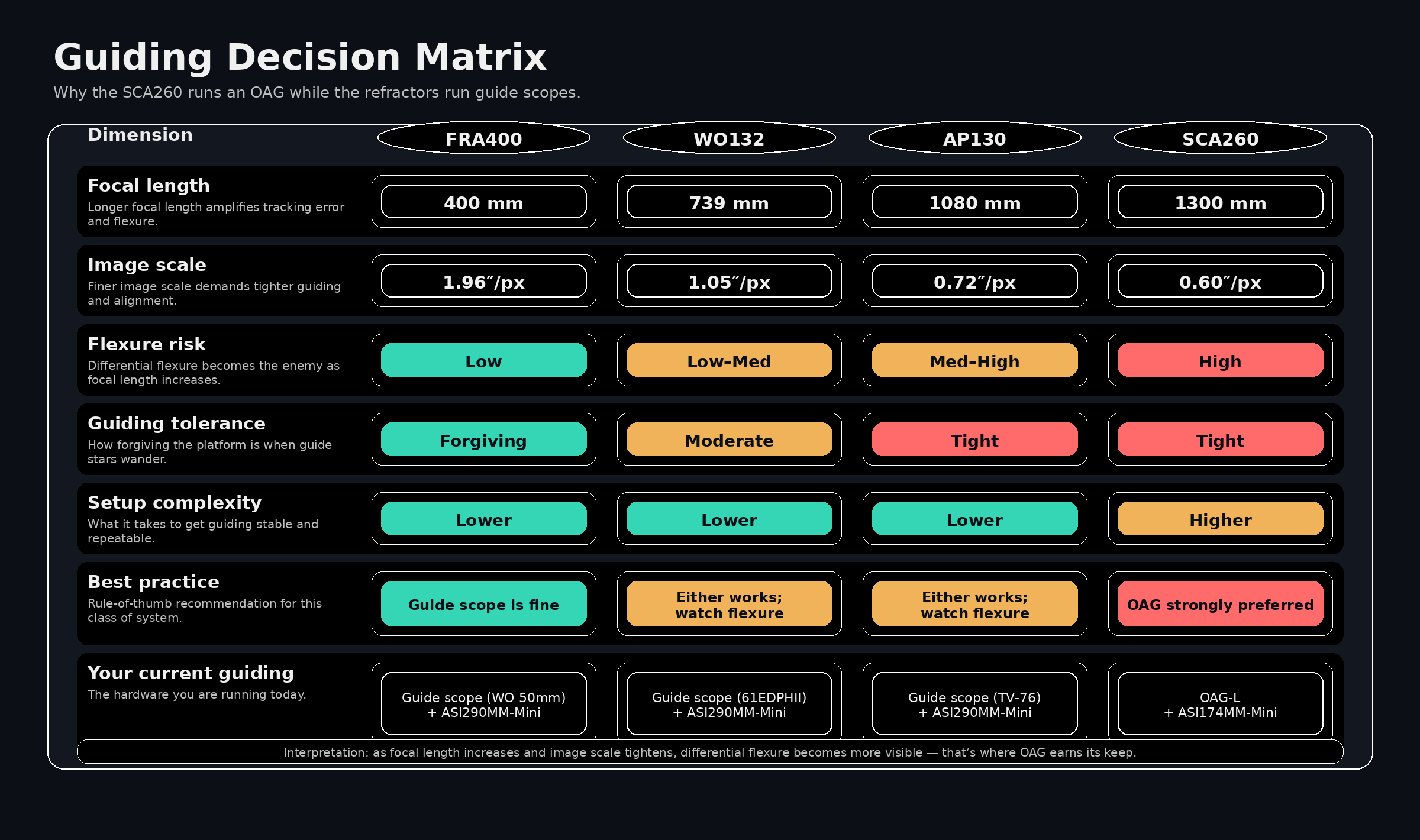 Then there’s the SCA260: longest focal length, tightest image scale, and the highest sensitivity to alignment and rigidity. That combination is exactly why the best-practice answer becomes blunt: OAG strongly preferred. It’s not because guide scopes can’t work at all—it’s because at this scale, the system will reveal every weakness upstream, and the OAG is the most direct way to remove differential flexure from the equation.