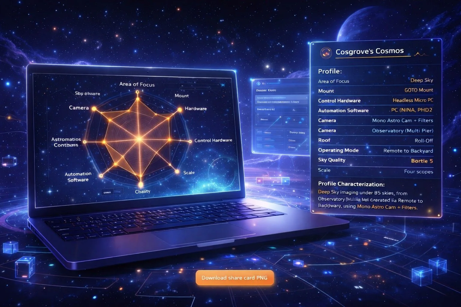 Choose one option per dimension. The compass and the profile update immediately. Use the "Download share card PNG" Button for a clean “take-away” (radar + all 10 fields + profile name/subtitle; without the dropdown menus) that you can share on social media, forums like Cloudy Nights, an astronomy club bio, or with friends.