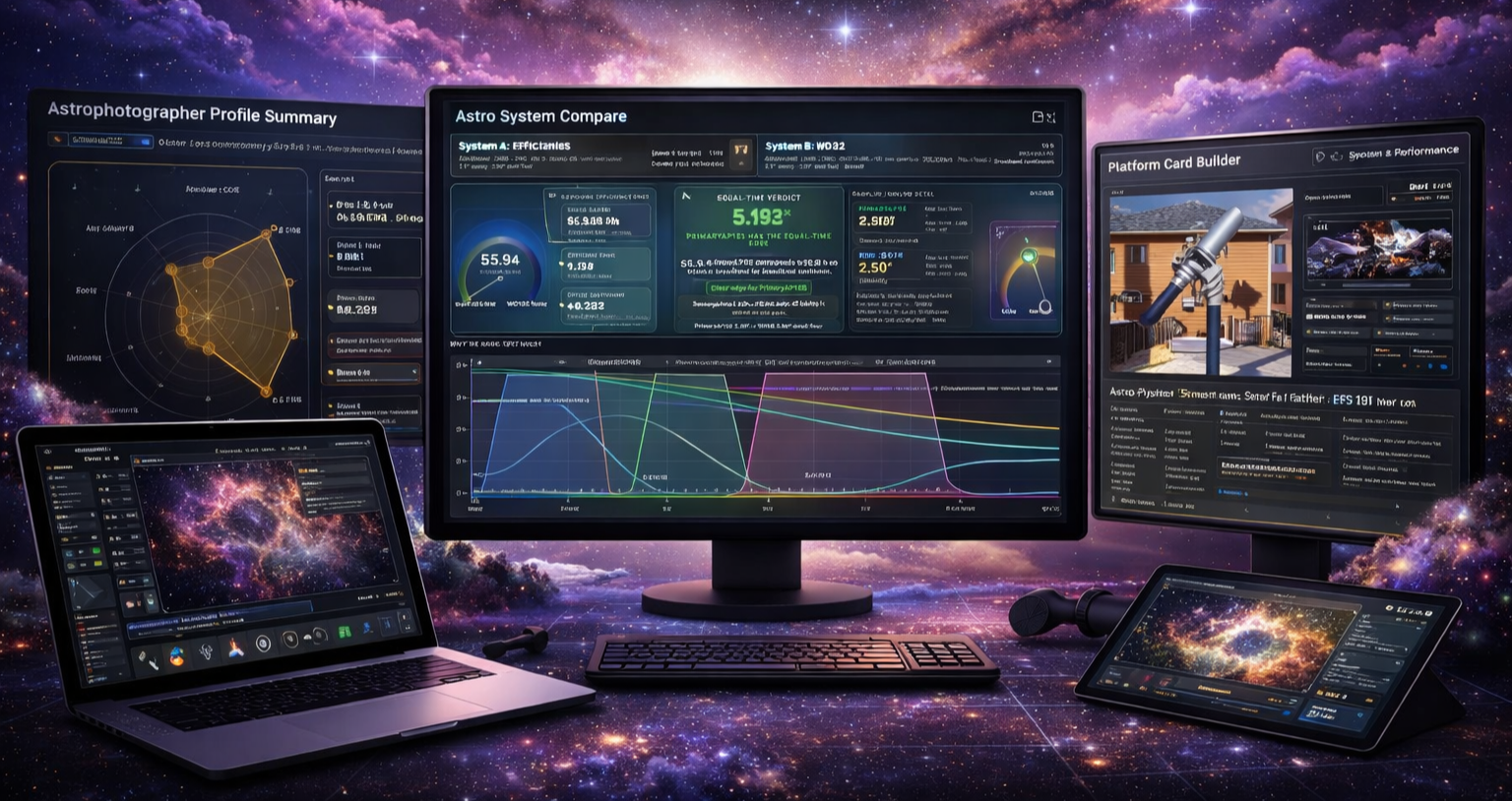 Creates polished telescope platform cards that combine equipment details with computed values such as focal ratio, image scale, field of view, and guide relationships.