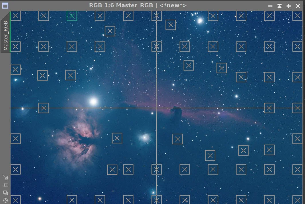 Run DBE for the Lum linear image. Use subtraction for the correction method. Choose a sampling plan that avoids the nebulae and bright stars. (see below)