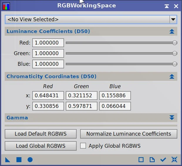Use the RGBWOrkingSpace Panel to set the RGB coefficients to 1.0. We don’t want color scaling for future operations.