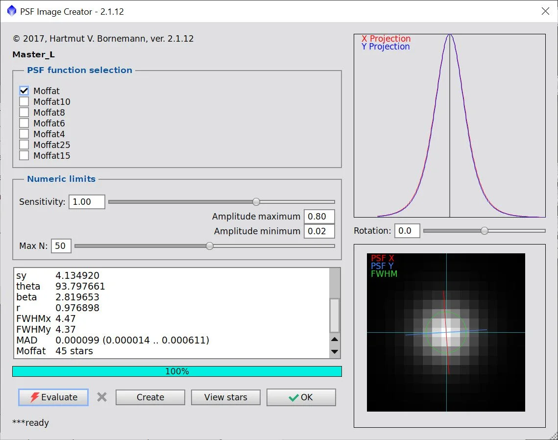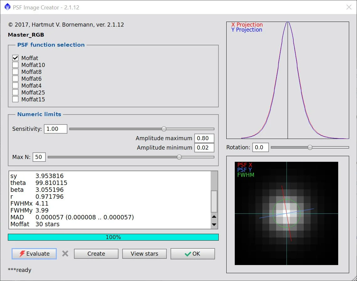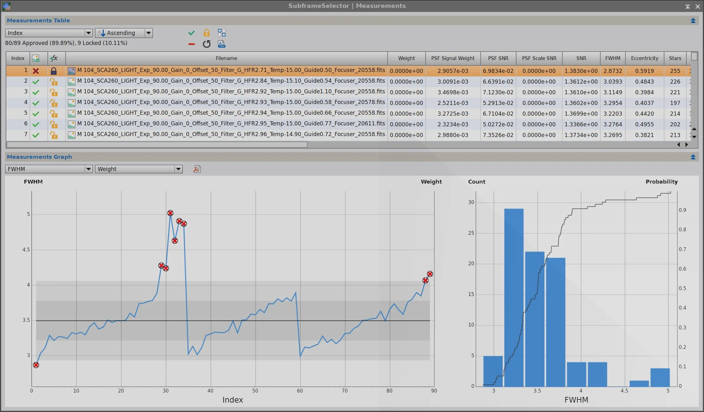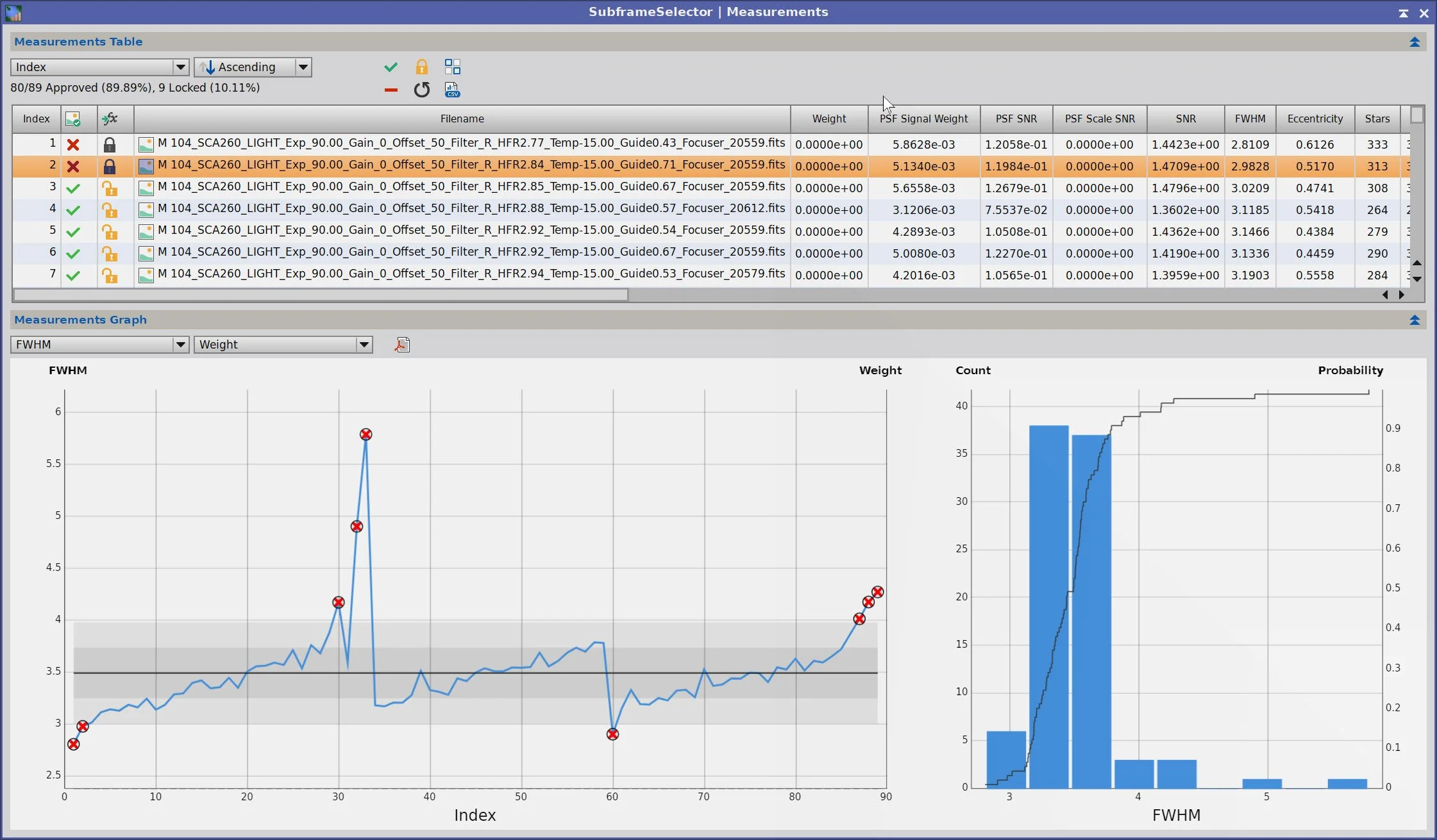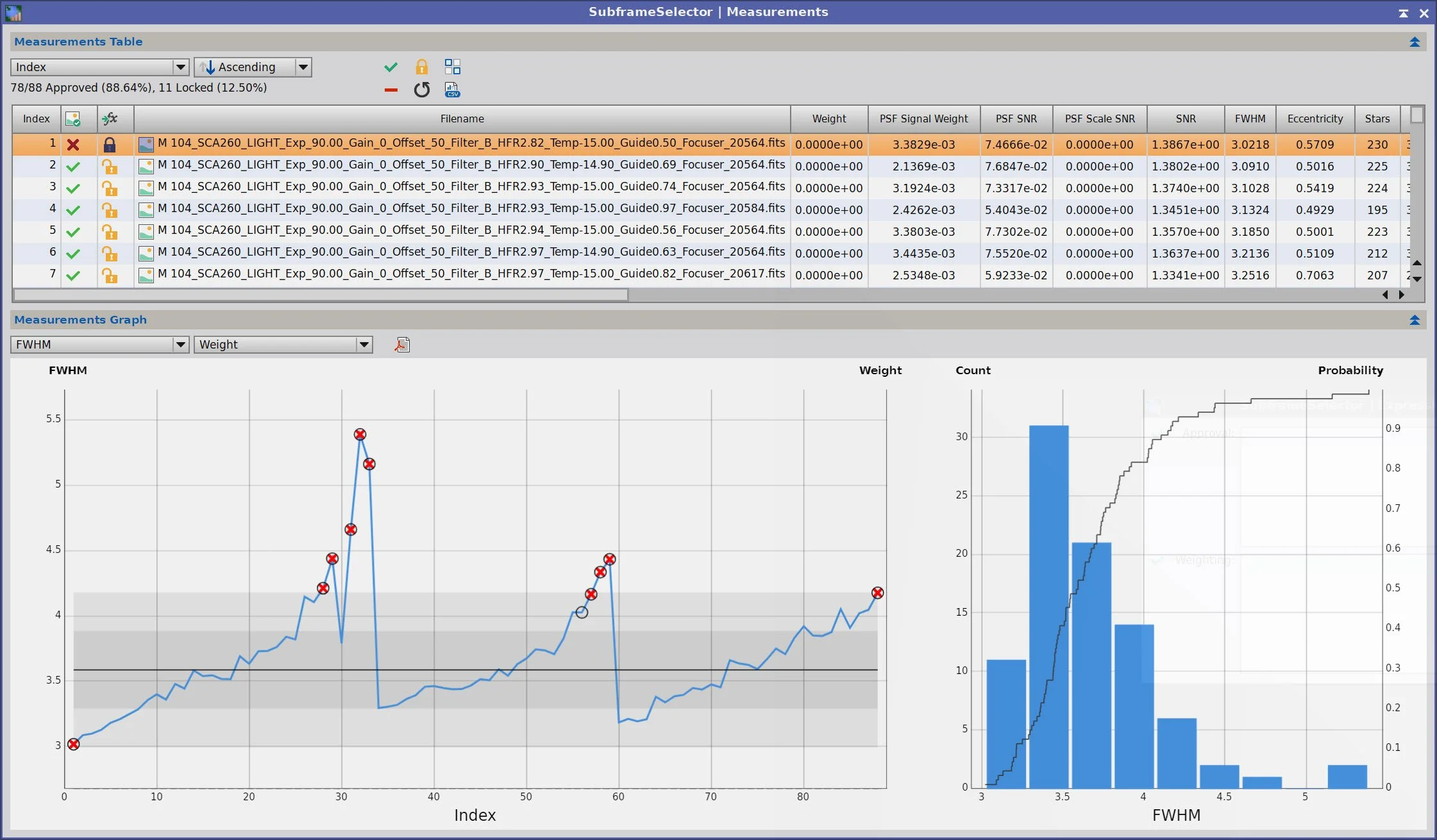 Getting critical details was crucial for this image, so I wanted to remove the subs that showed statistically significant detail degradation. To determine which frames, I used SubFrameSelector to examine the FWHM size of stars and removed those outside the confidence bands.
