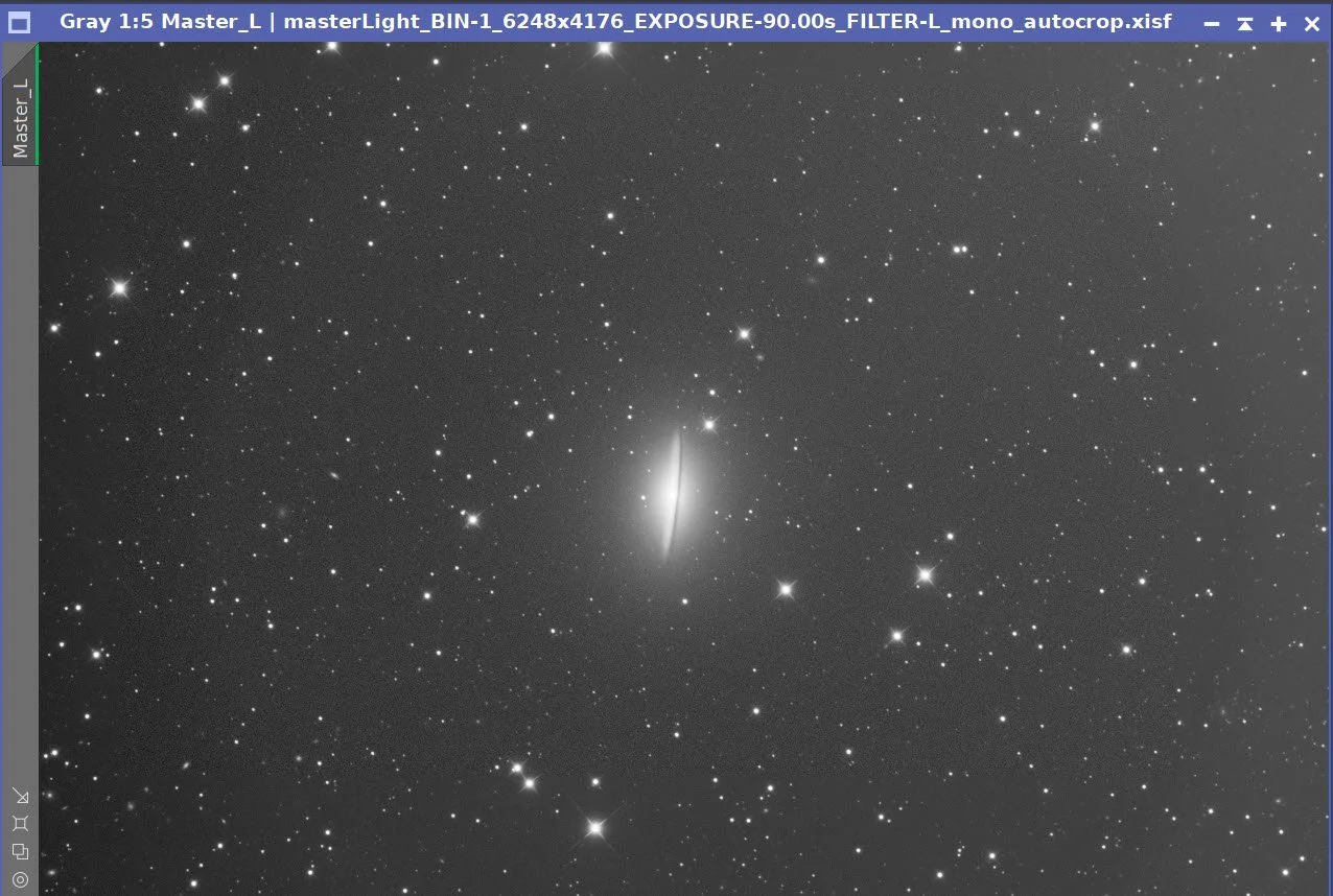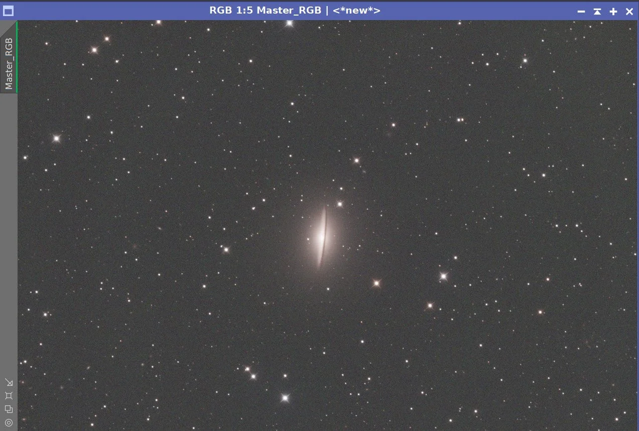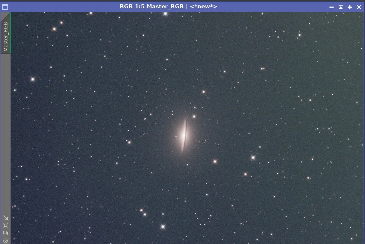The main processing challenge for this image was balancing the very bright core and sharp dust lane against the much fainter outer halo of M104. I used a fairly conservative LRGB workflow: careful frame rejection, separate luminance and RGB preparation, star removal for nonlinear work, luminance-driven detail enhancement, and final star recombination before a light Photoshop polish.