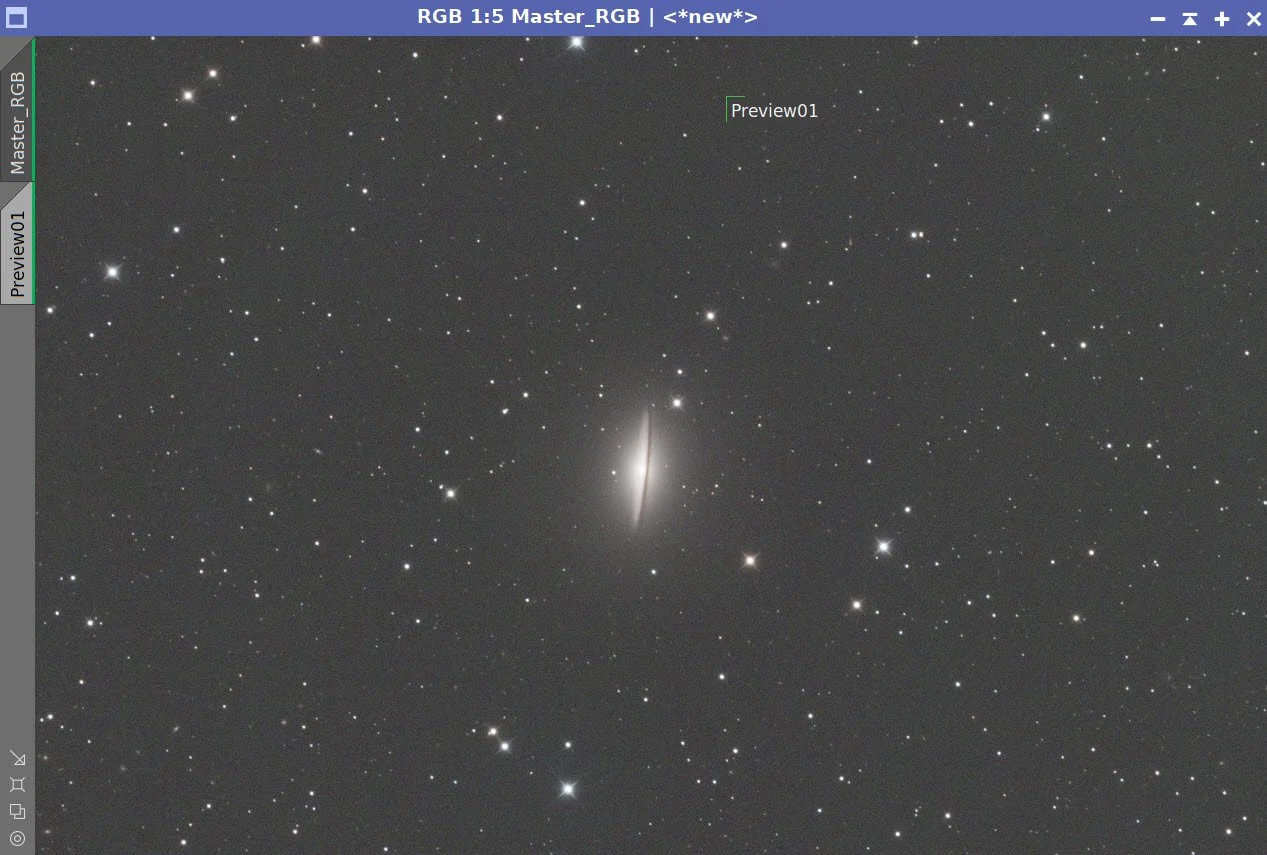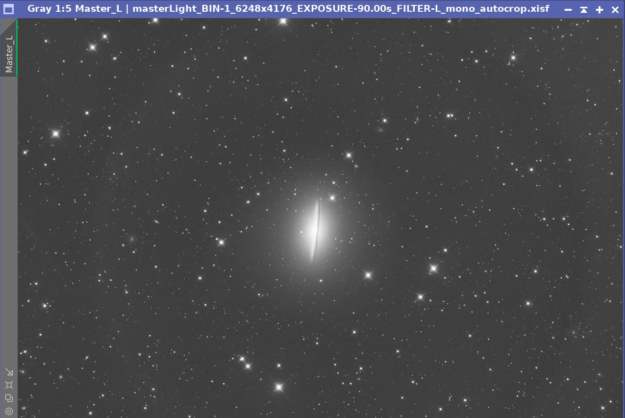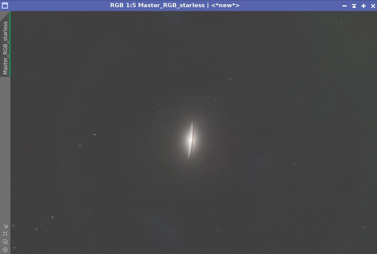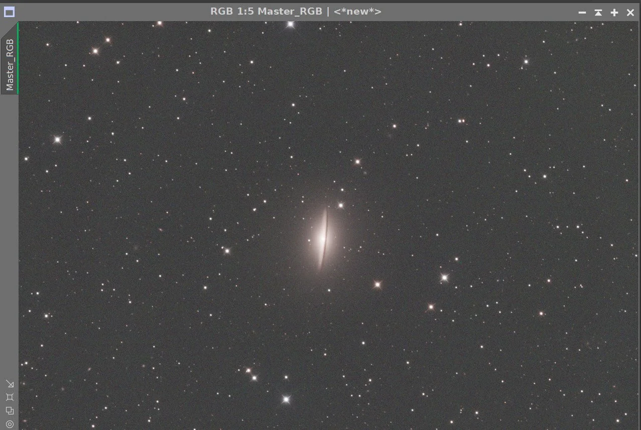 The main processing challenge for this image was balancing the very bright core and sharp dust lane against the much fainter outer halo of M104. I used a fairly conservative LRGB workflow: careful frame rejection, separate luminance and RGB preparation, star removal for nonlinear work, luminance-driven detail enhancement, and final star recombination before a light Photoshop polish.