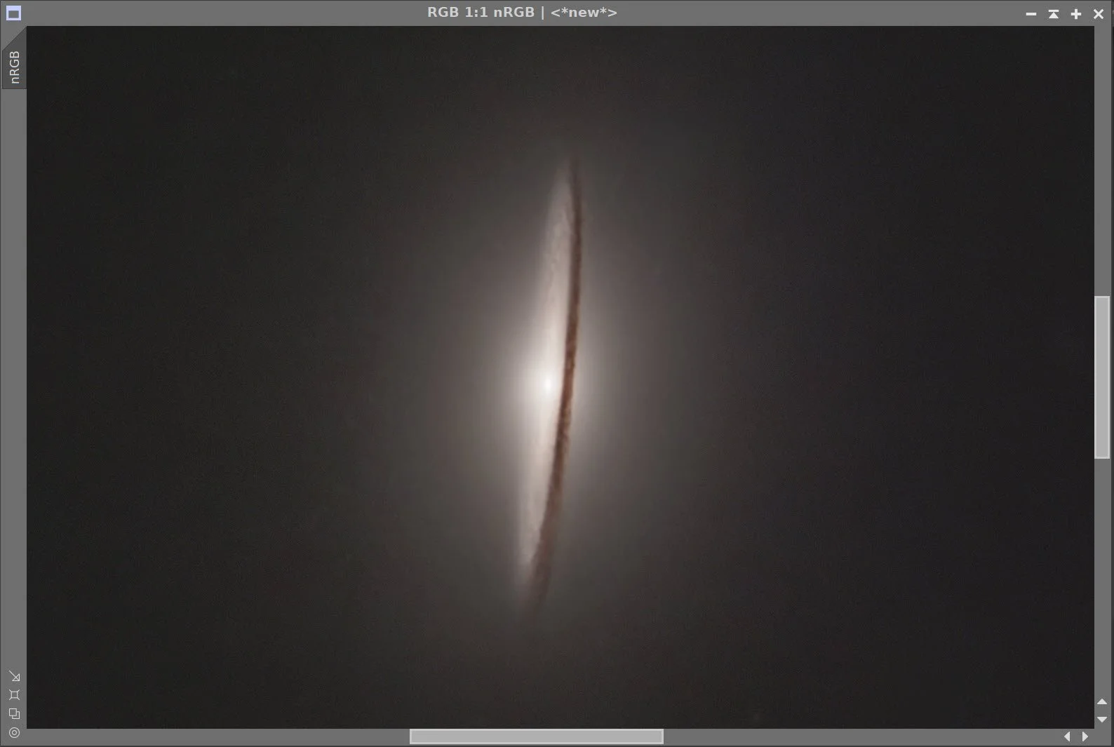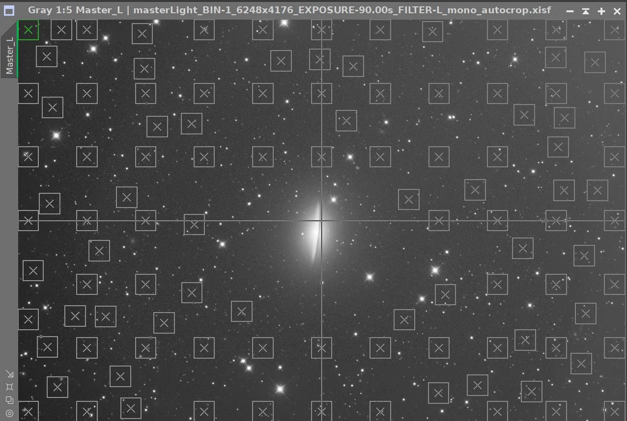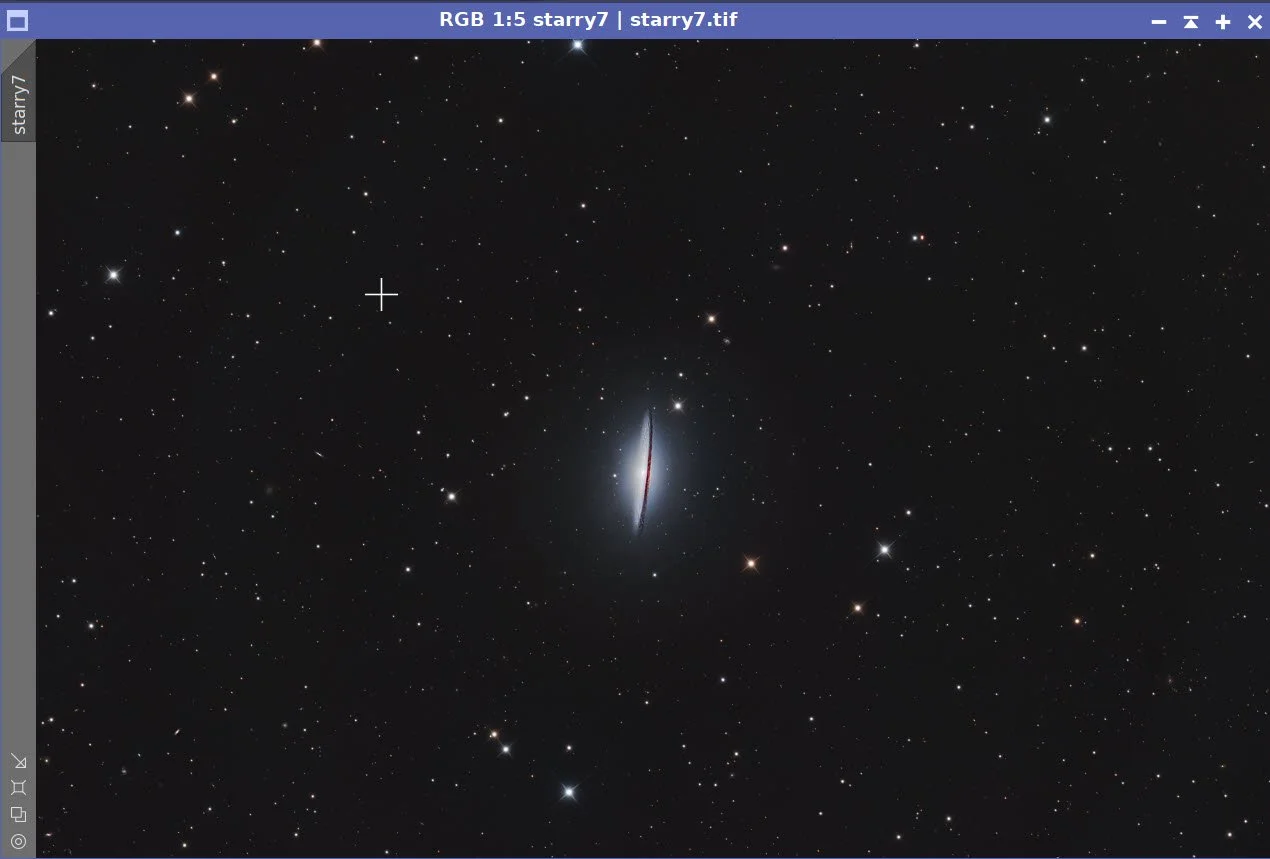 The big issue here is cropping. Because I did not rotate the camera for this framing during capture, the galaxy came in sideways. I chose a rotation and a heavy crop to bring the galaxy into scale. I chose a rotation and a heavy crop to bring the galaxy into scale.