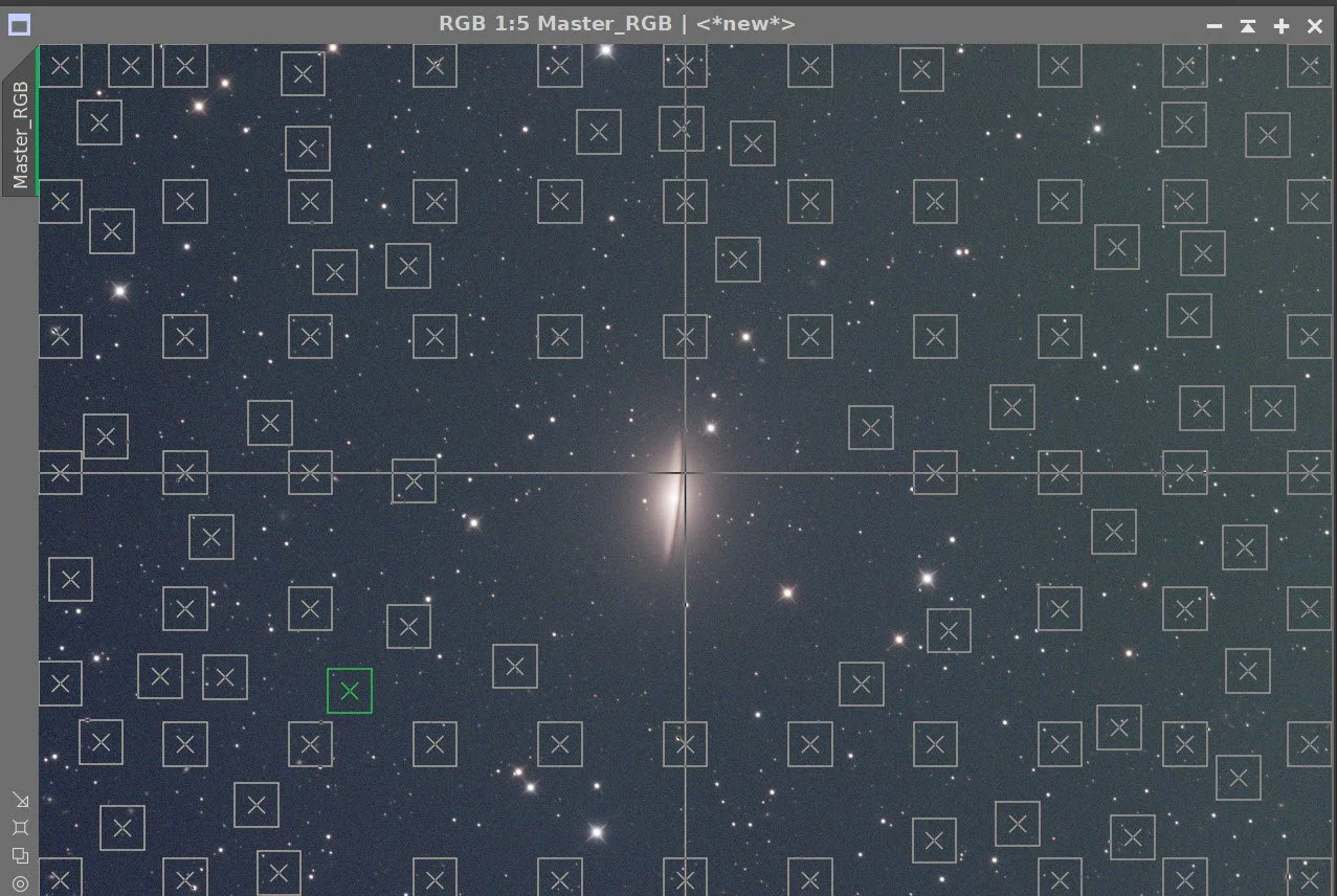 Run DBE for the RGB linear image. Use subtraction for the correction method. Start with the same sampling plan from the Lum run. Choose a sampling plan that avoids the galaxies and bright stars. (see below)