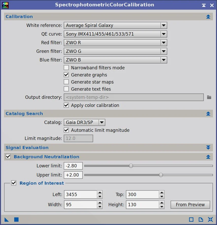 Select a background preview, then set up and run SPCC. See the SPCC Panel shot below for the parameters used.