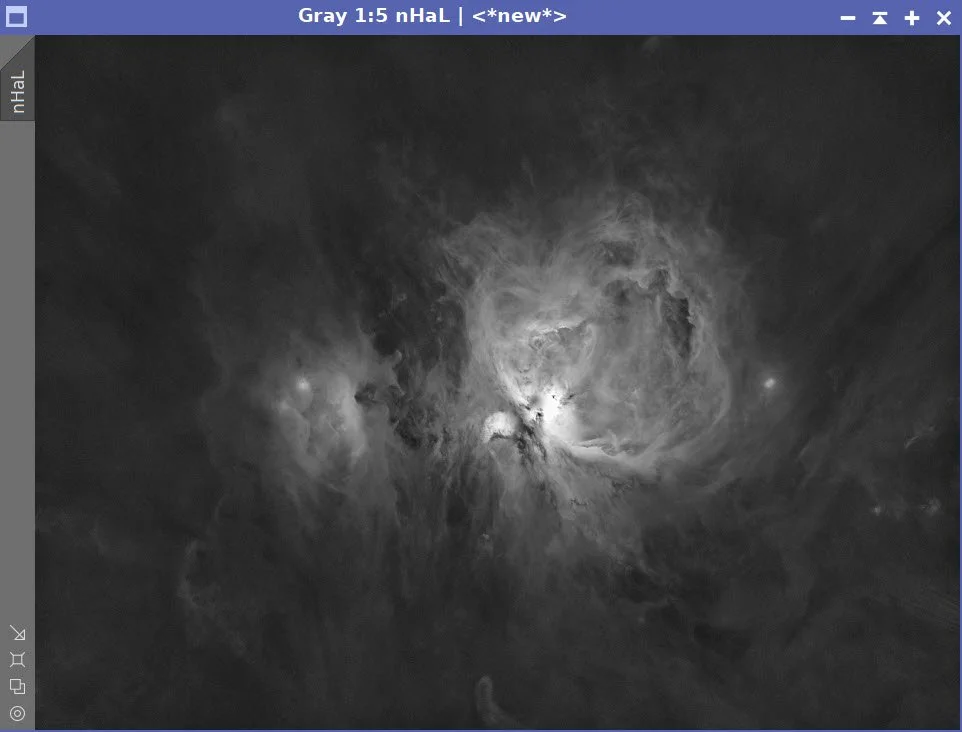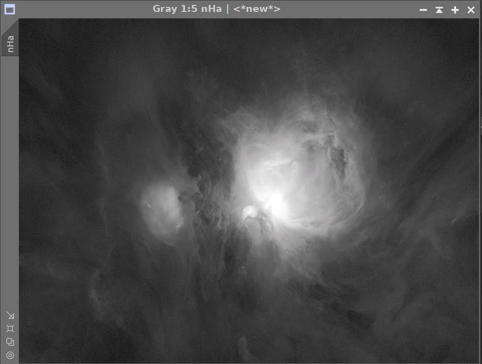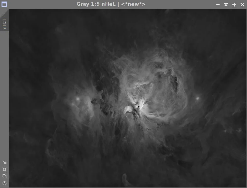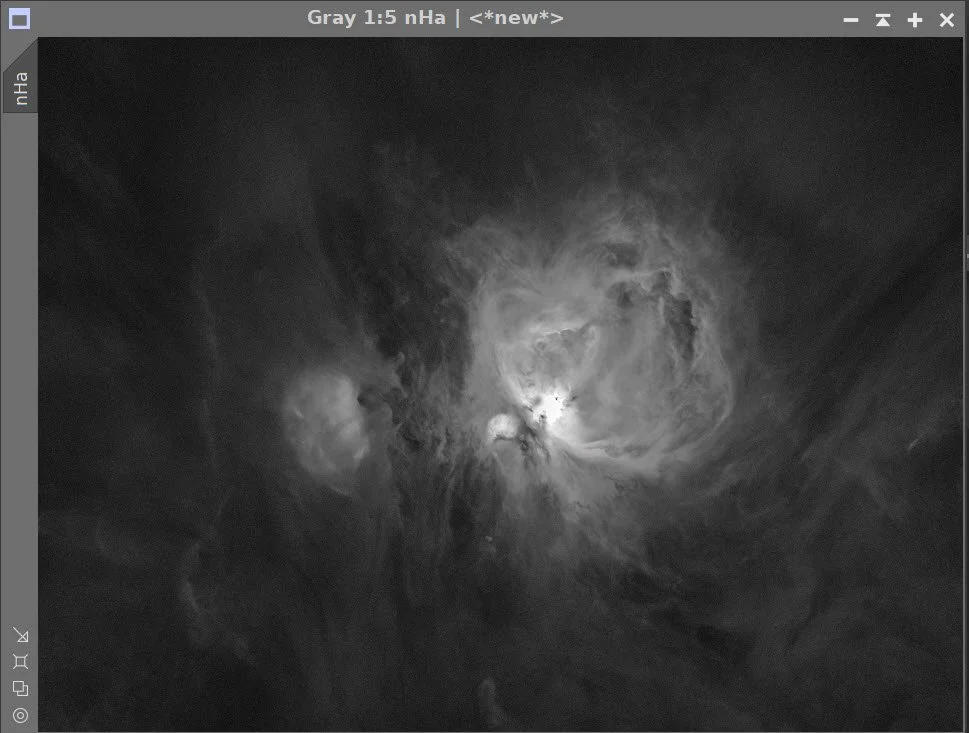 Using the STF->HT Method, convert the linear Lum and Ha images to nonlinear. Remember that we did a LinearFit of the Ha to the L image, so use the STF when doing this.