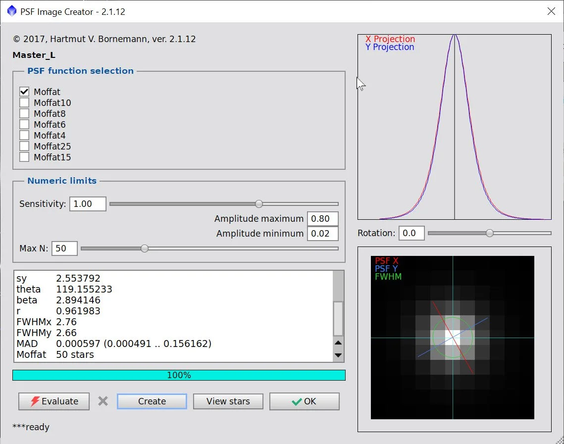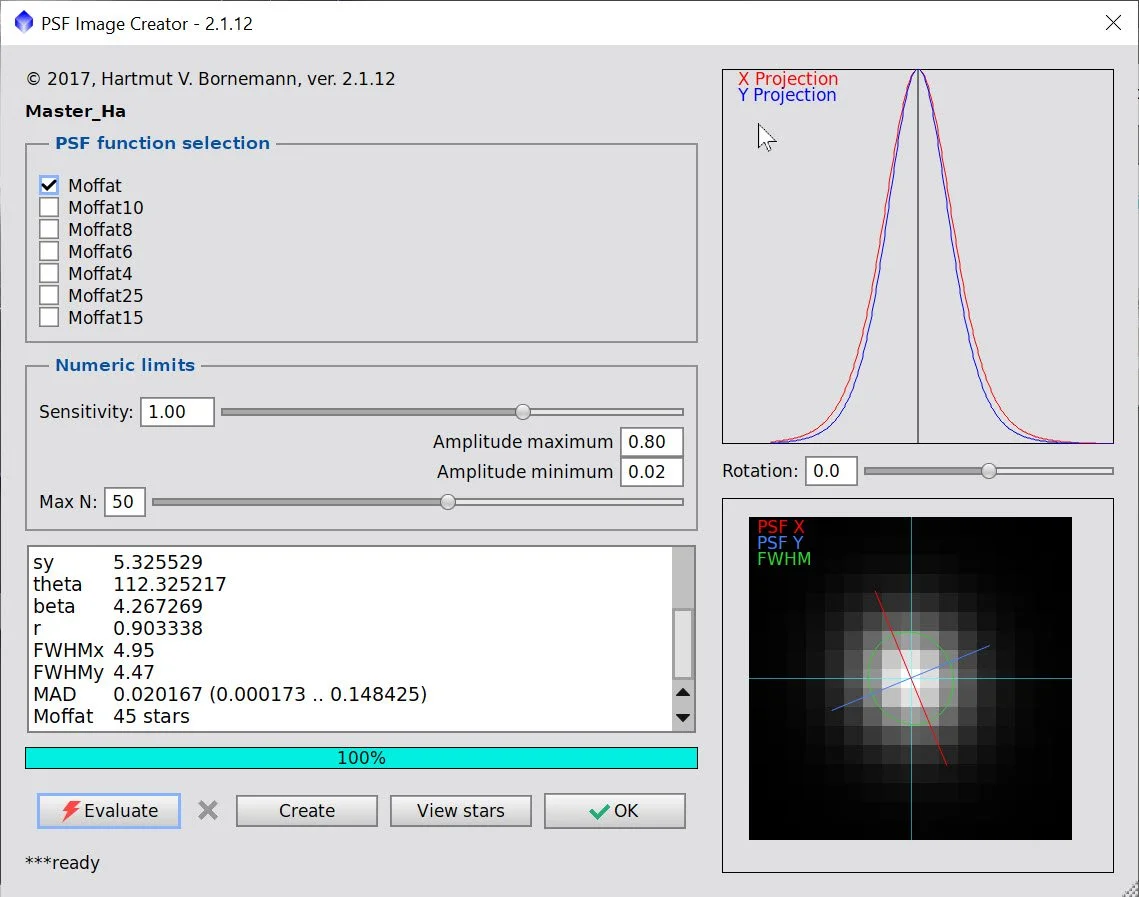 Run the PFSImage script to measure star sizes. X = 4.95, Y 4.47. This will influence the values used in BXT.