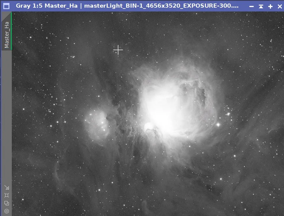 The Ha data shows nebulosity spanning the entire frame, and I saw no obvious gradients, so I elected NOT to run DBE on it.