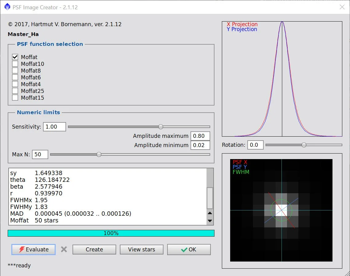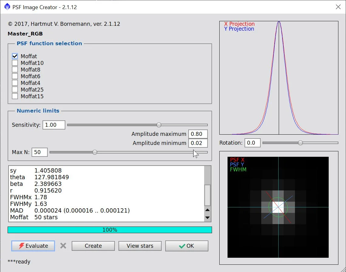 Run the PSFImage script to measure star sizes. X = 1.95, Y 1.83. This will influence the values used in BXT.