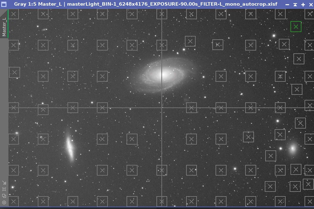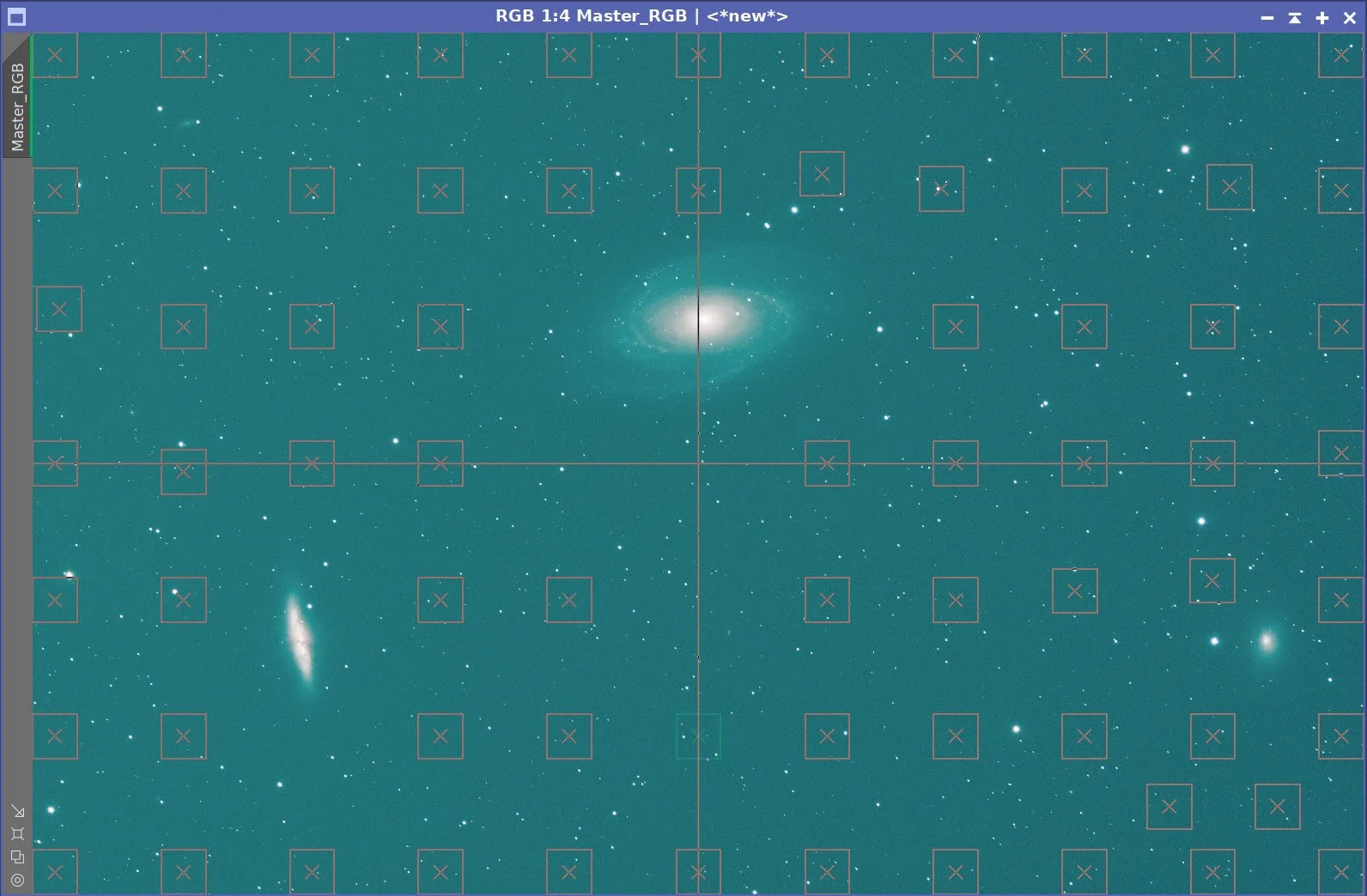 Run DBE for the L linear image. Use subtraction for the correction method. Choose a sampling plan that avoids the main galaxies and bright stars. Enhance sampling points in areas with greater fall-off. (see below)