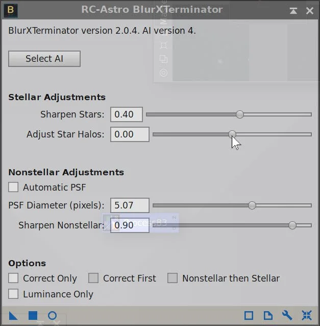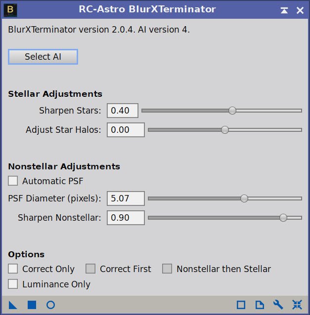 Run Full BXT - I am using an enhanced set of values to shrink stars more. These are about a third more than the measured star sizes. See the BXT Panel Snapshot below.