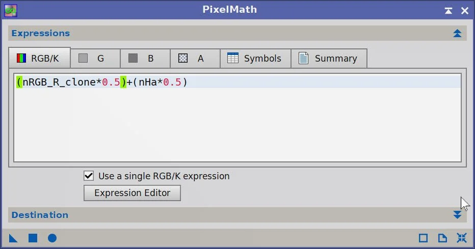 Set up PixelMath to blend the HA and Red image.s See the equation set up in PixelMath Below.