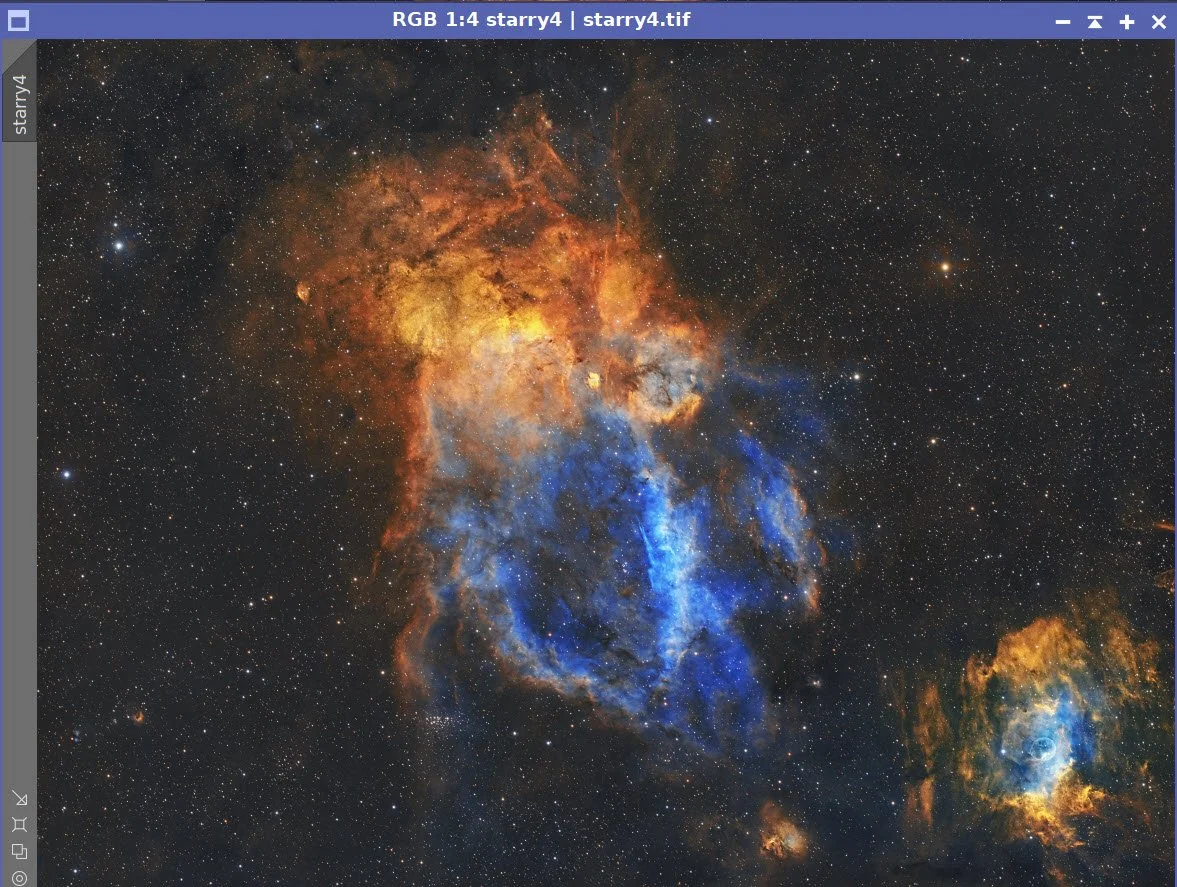 On one level, this was a complicated process. The main complication was the need to process the RGB subframe separately from the SHO subframes. On the other hand, the processing steps used were simple and straightforward, and I had little trouble dealing with noise.