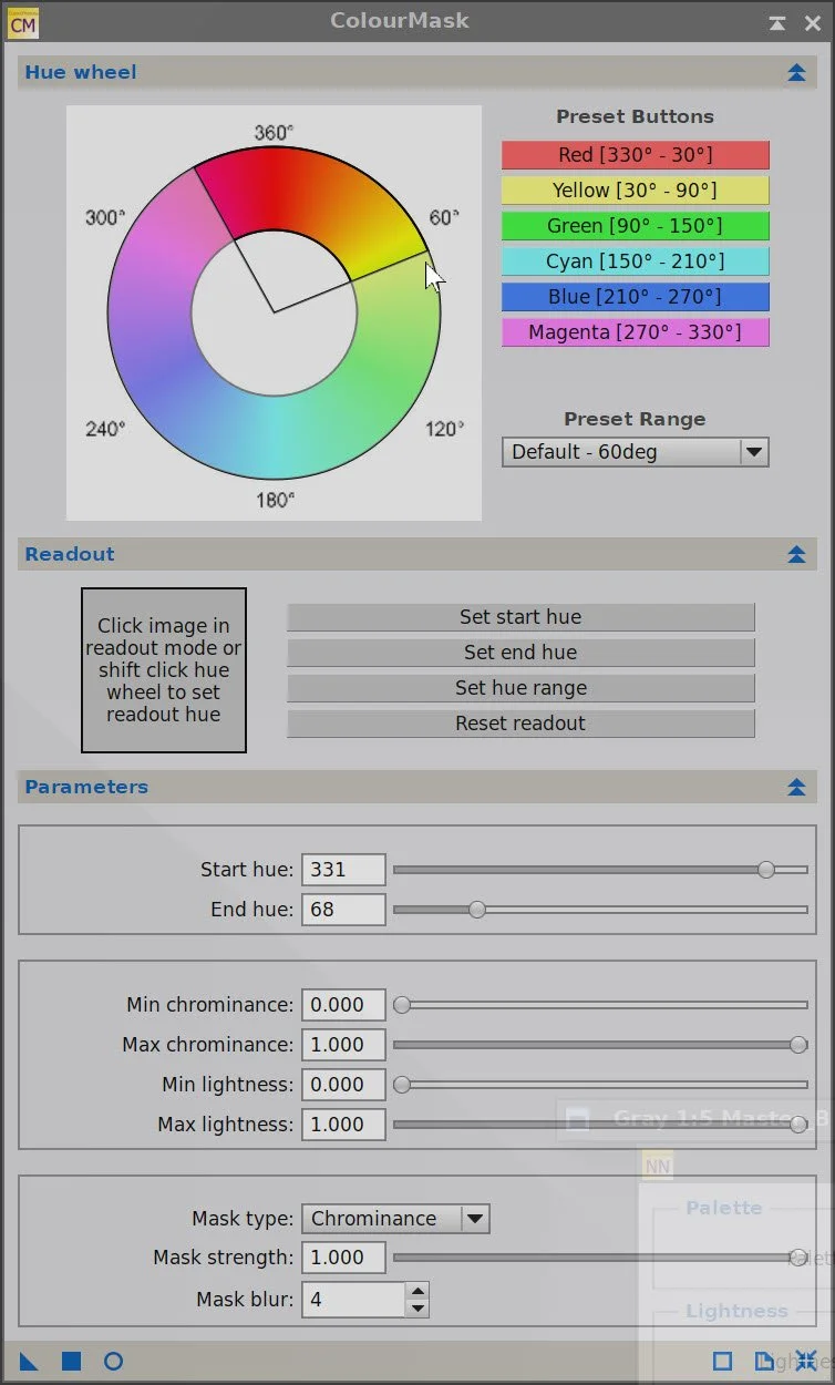 Use the ColourMask Process with Star Hue 331 and end hue 68, with a blur of 5