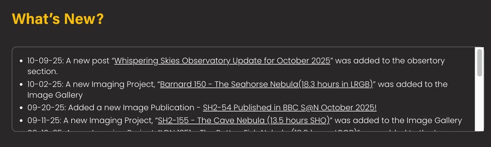 I wanted to simplify this. I purchased a plug-in module that enables me to display filtered views of the image gallery. You now have access to the full gallery, with the next menu item providing a view that includes a selector and search boxes at the top. This allows you to create narrower views. Want to see all of the images taken in 2022 on the Williams Optics Telescope? Now you can. Want to see just pictures of galaxies? Now you can. I save a lot of metadata for each imaging project (these are the keywords you see listed under the bottom of each image thumbnail), and you can also do a free-form search for any of those. As the image gallery grows, this should provide a big help in searching and navigating across the image collection.