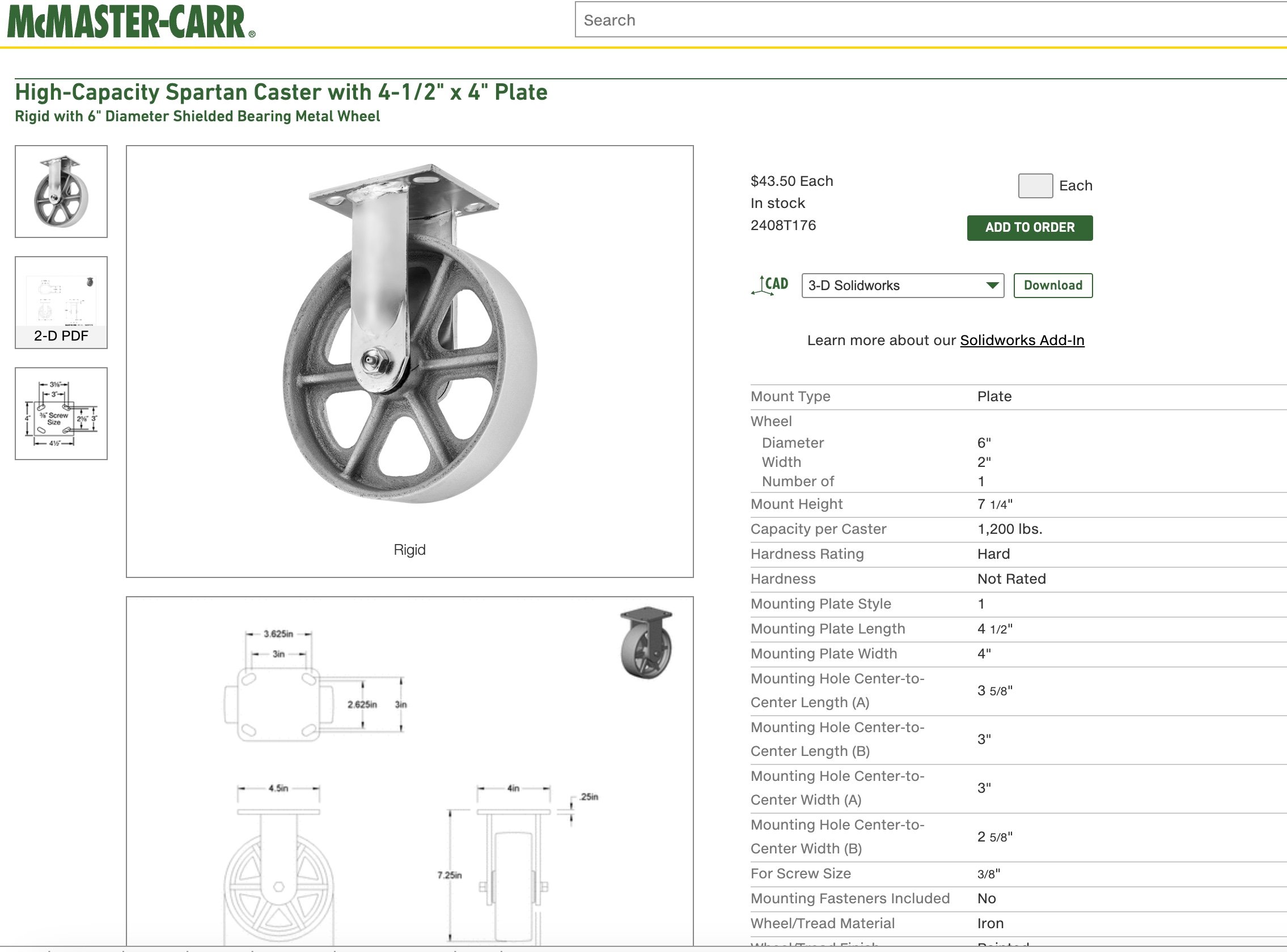 This wheel is 7.25” high and 4 inches wide. The same as the V-Wheel. It can handle a 1,200-lb load and goes for $43 each. Again, I will get 6 of them, and I am planning on using five of them on the track and one backup.
