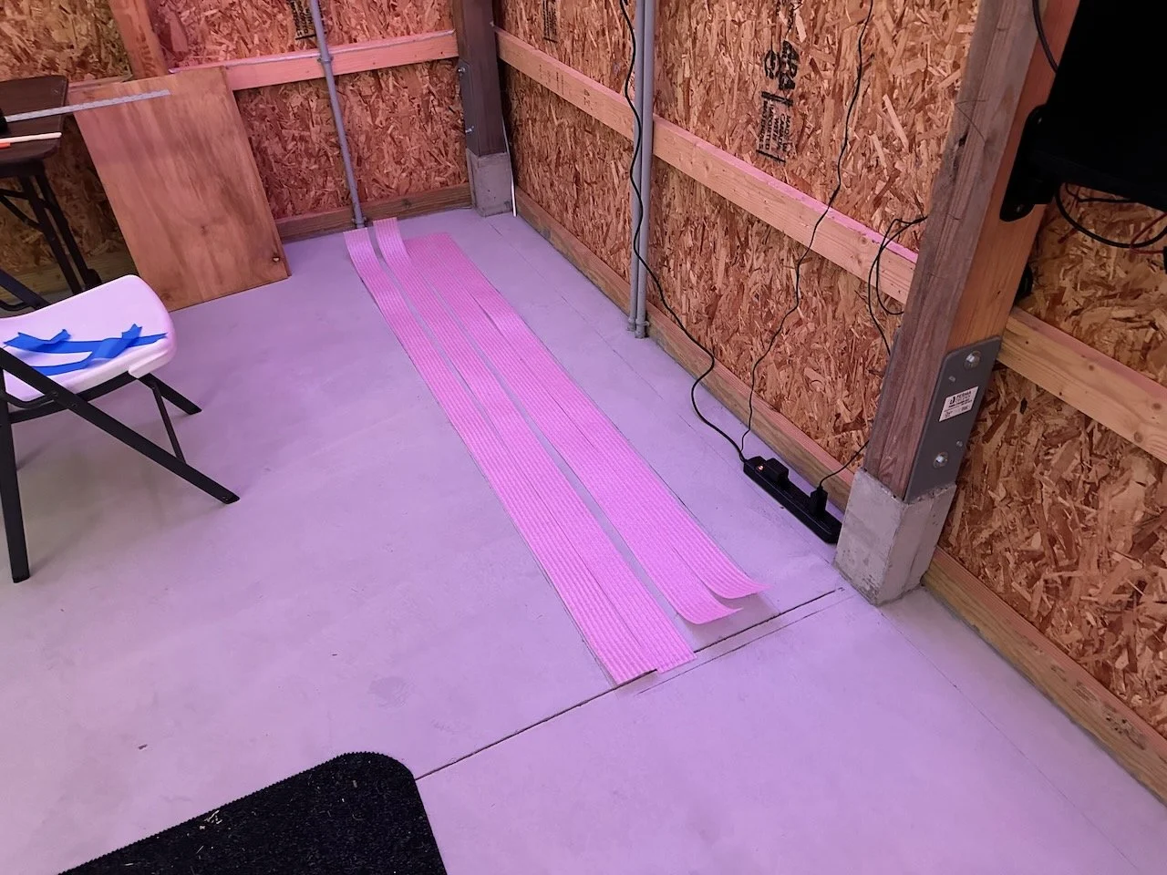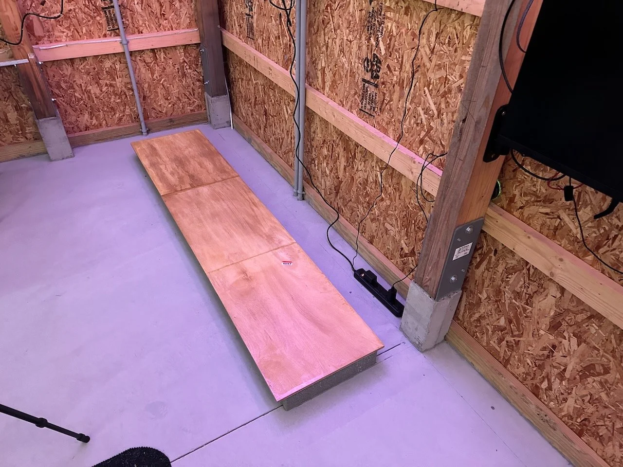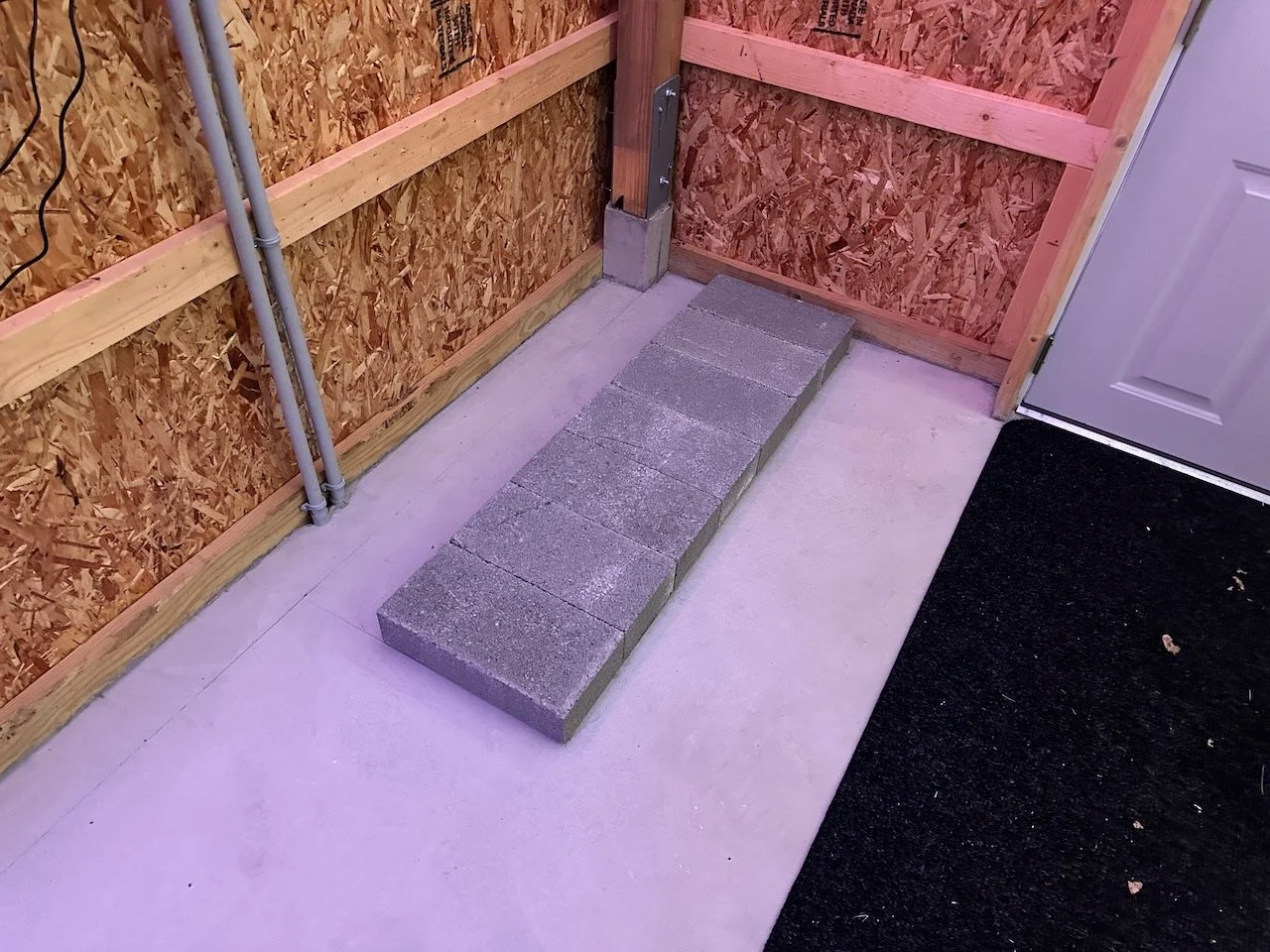 I started by laying out strips of sill seal to break a connection with the concrete floor. Then the blocks were laid, and the plywood plates were installed on top. Finally, two strips of rubber tape were applied to the plywood to prevent the cabinets from sliding.