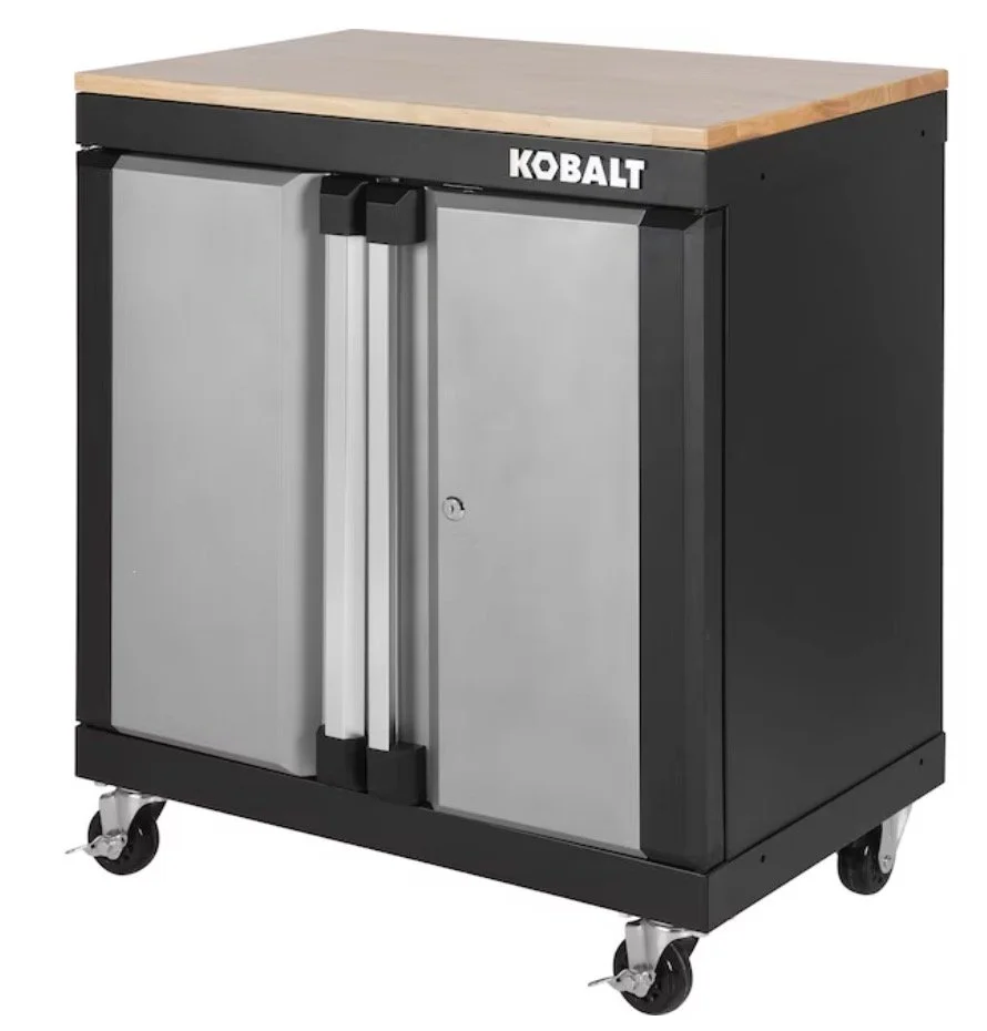 I found small cabinets at Lowe’s branded as Kobalt. They came in two basic configurations: either a four-drawer unit or a two-door unit. The product line also included a matching set of wall cabinets. The case had a black frame, gray doors, and drawers that looked great.