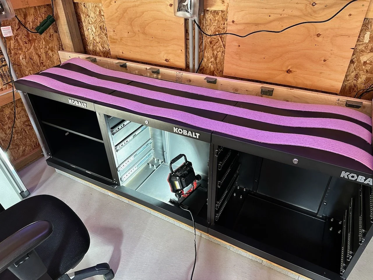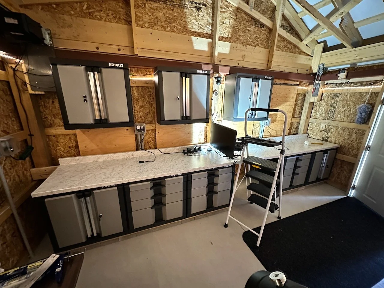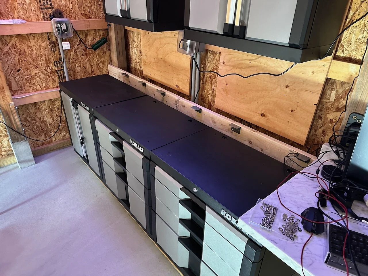 - Base cabinets: 5 total (Kobalt metal garage cabinets).