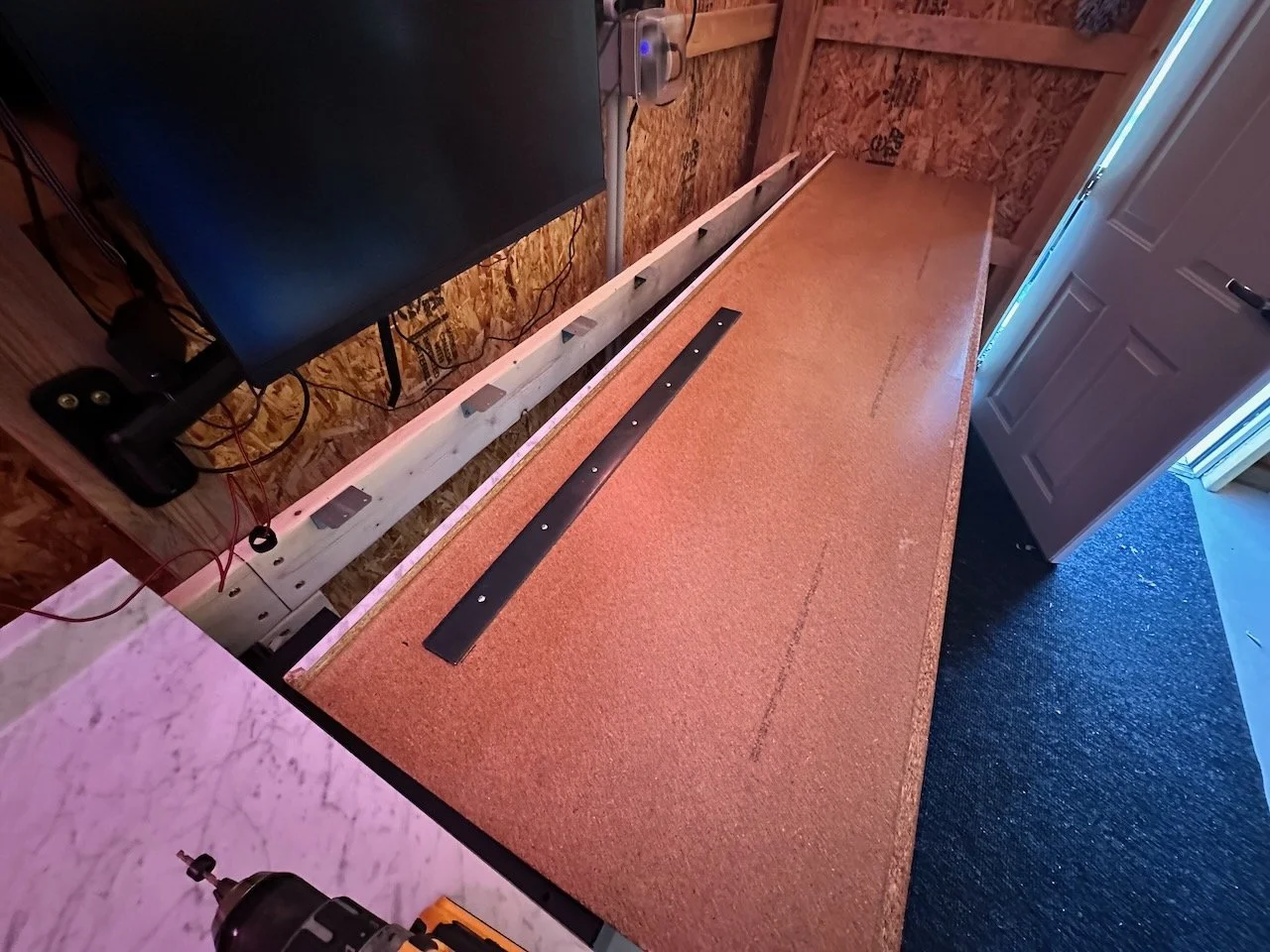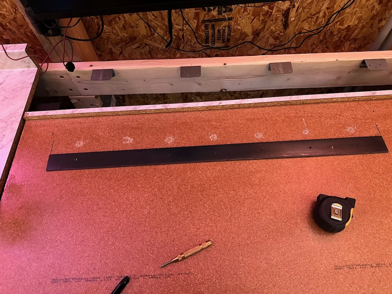 I also flipped the countertop section upside down. I took a 2 x 36 x 1/8-inch steel bar, drilled holes in it, and screwed it into the bottom of the particleboard, a few inches back from the front. I drilled a smaller pilot hole in the particleboard for the screws. I used a drill stop collar to ensure that these pilot holes did not get to close to the formica top.