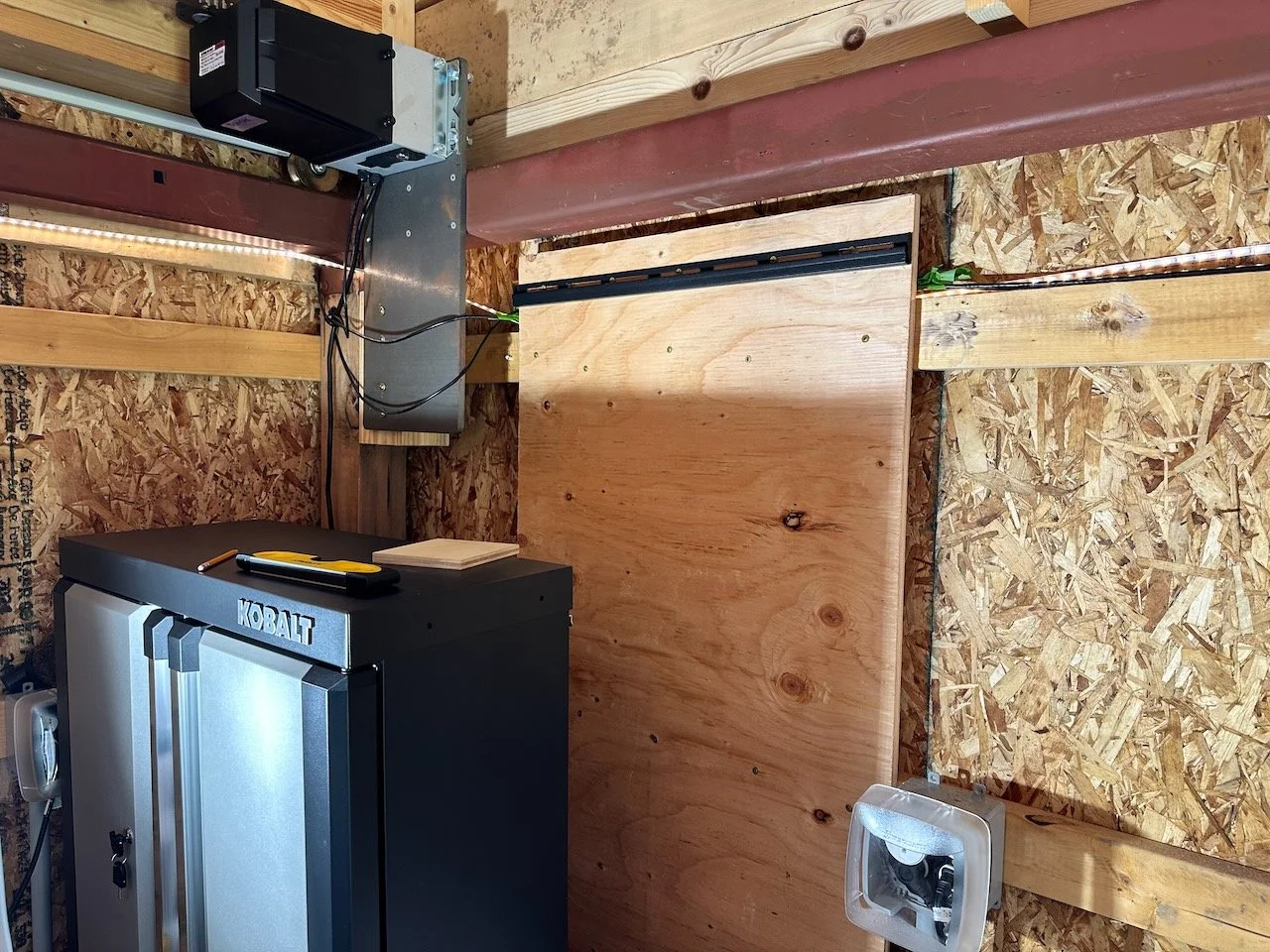 - Wall cabinets: 4 total; mounted using 3/4" plywood backers (28" wide × 48" tall).