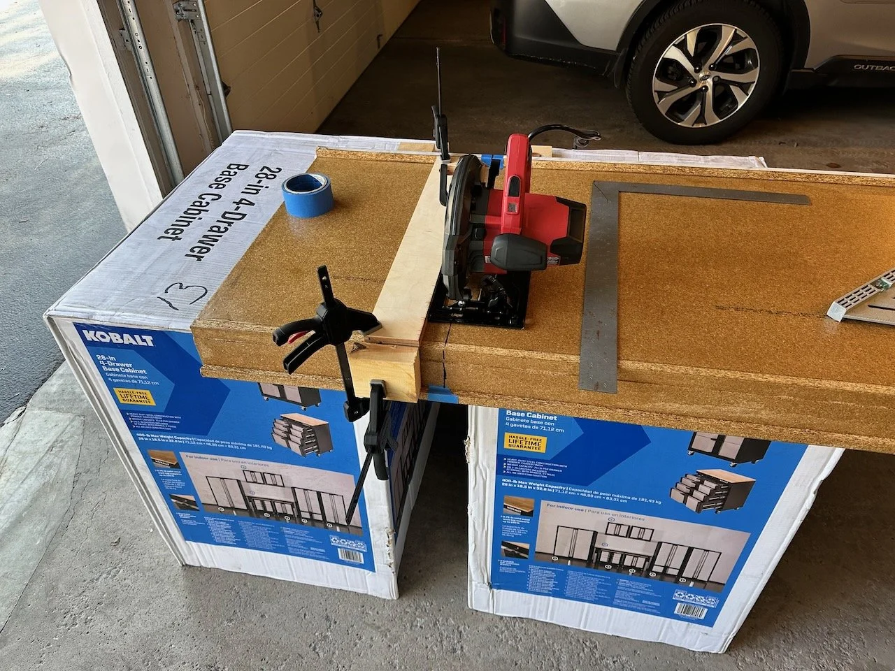 Cutting the countertop to length is tricky because the profile is a 'Z' shape. But a few YouTube videos taught me the best way to do this. So after taping up the cut zone, clamping some scrap wood guides, and putting a finer-toothed saw blade on my circular saw, I went to work.