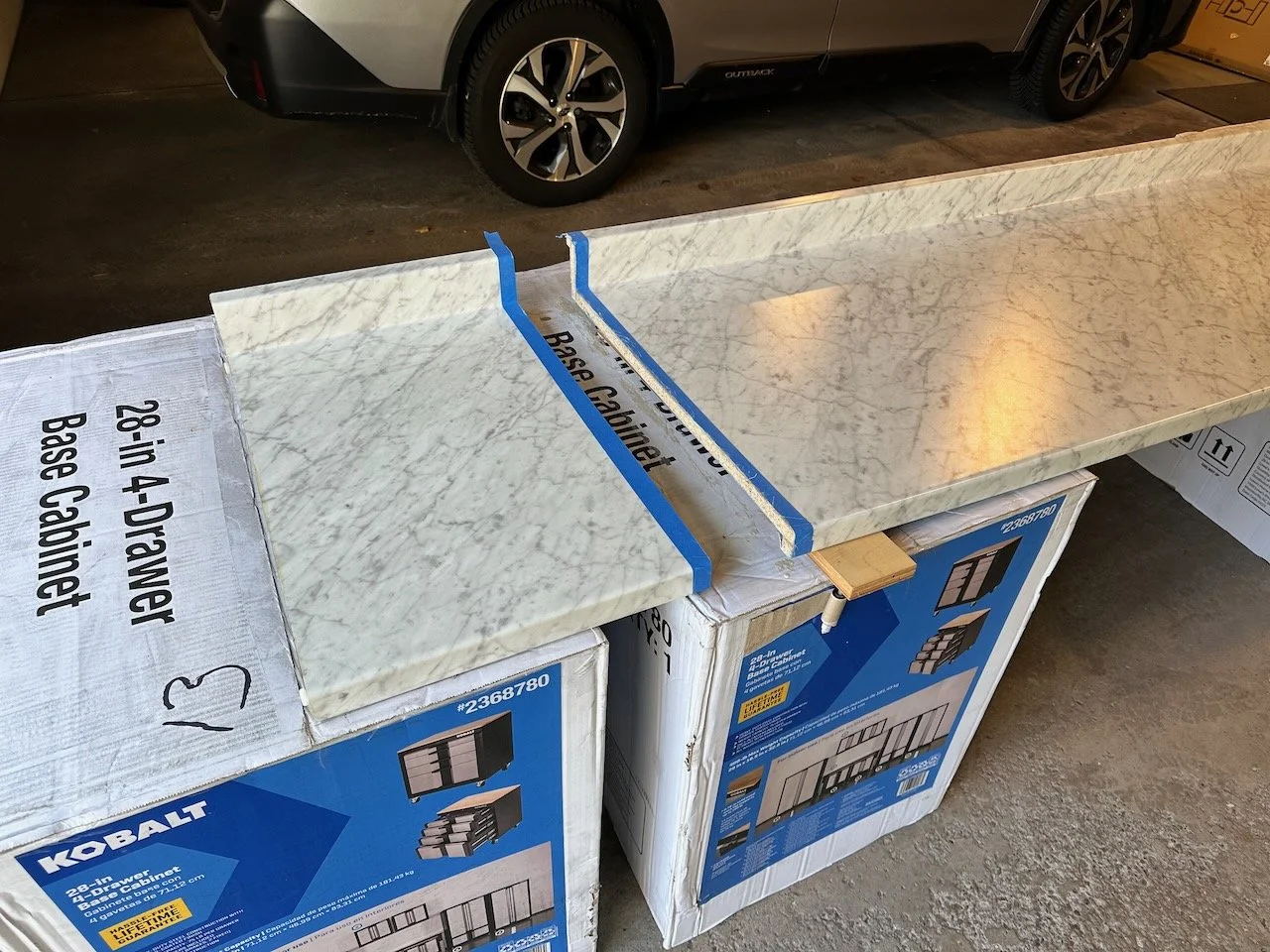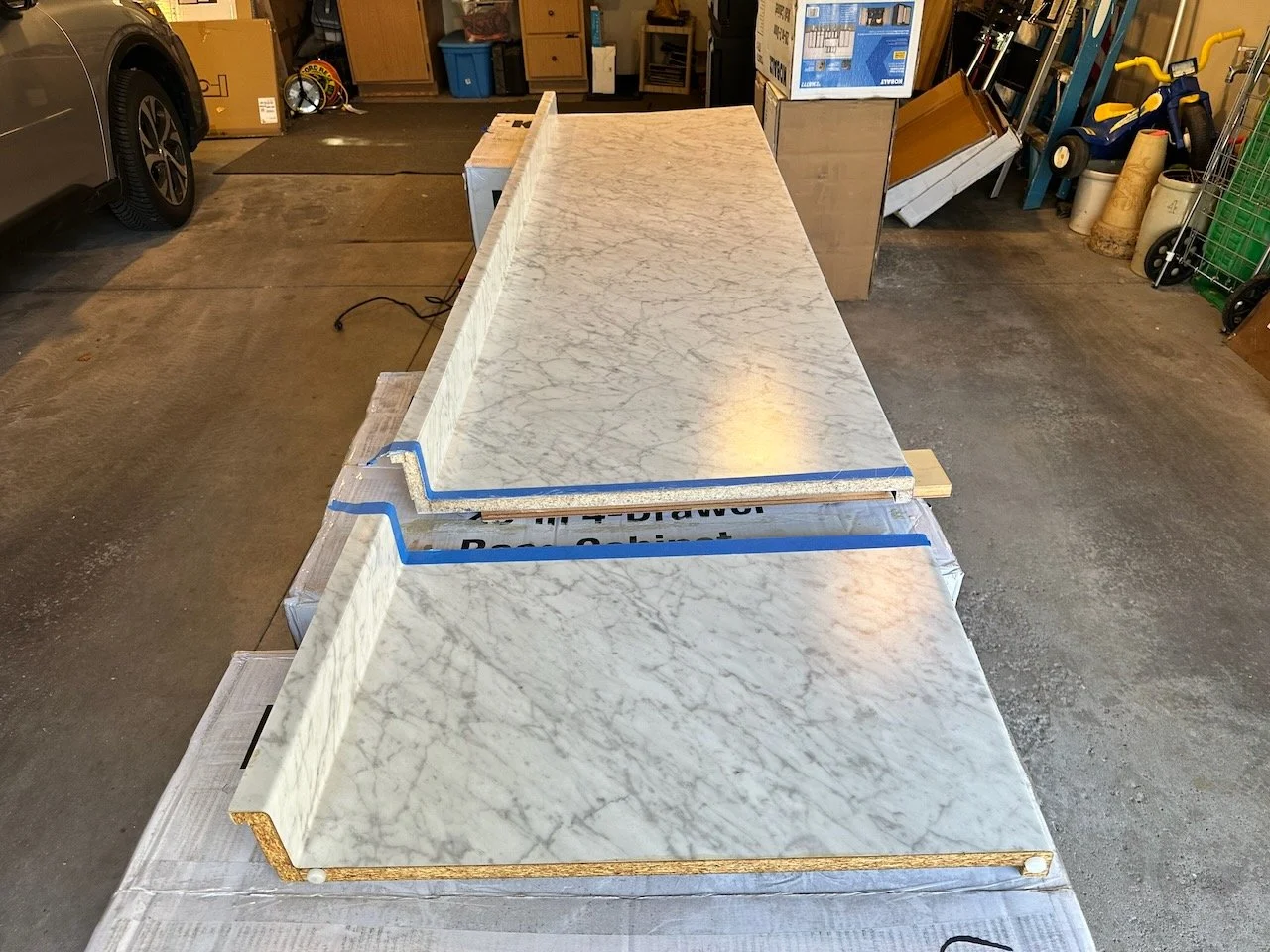 - Countertops: two 8' laminated sections (marbled white); one section trimmed to final length on install.