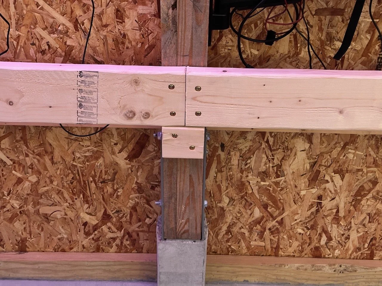 Since the observatory was built using pole-barn methods, I did not have a standard set of 2x4 studs to mount the ledger on. But I did have heavy-duty columns at the ends and in the middle. These were still roughly 8-foot sections, so I used 2x6s as the ledger board and GRK construction screws. I assumed that once I had these in place, I would have to rig some supports at least mid-ledger. But once I got them in, I was impressed with how solid this was. The use of 2x6's was a good call!