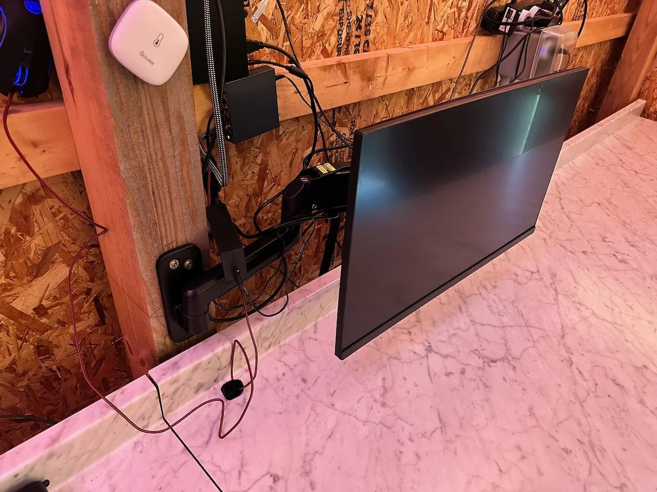 I originally had the computer monitor mounted on a pneumatic arm attached to the east side of the center post. This would no longer work with the countertops in place due to