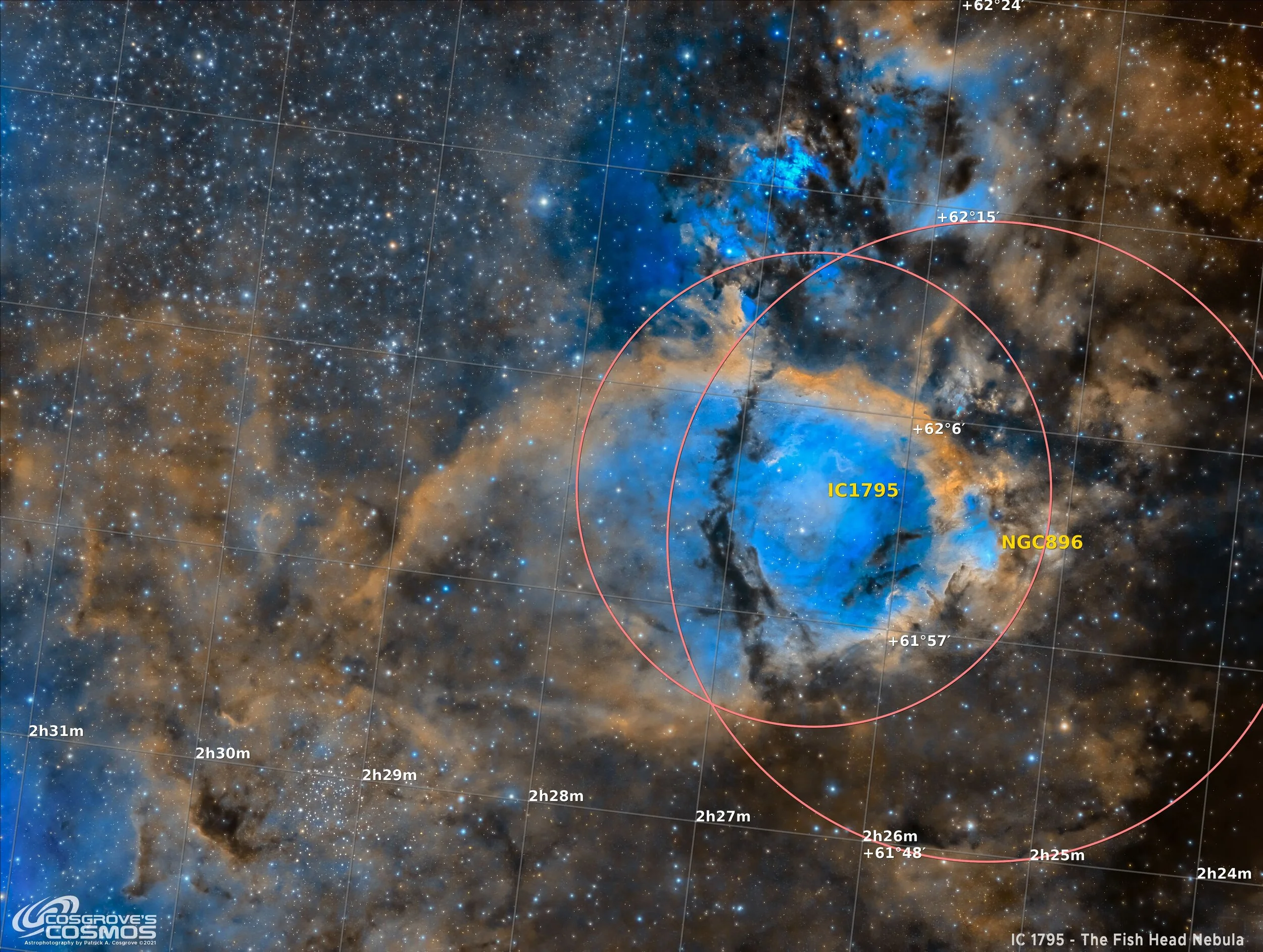 IC 1795, also know as the Fish Head Nebula, is an area of new star formation with glowing gas and dust, in the constellation of Cassiopeia. It is actually a portion of the larger Heart Nebula complex (IC 1805) that is located about 6000 light-years from earth. Since my scope cannot fit the entire Heart nebula into its field of view, I opted to frame just the fish head portion of the nebula. This was to be shot with my Mono camera and narrowband filters so that I could get the Hubble Palette colors that I am quite fond of.