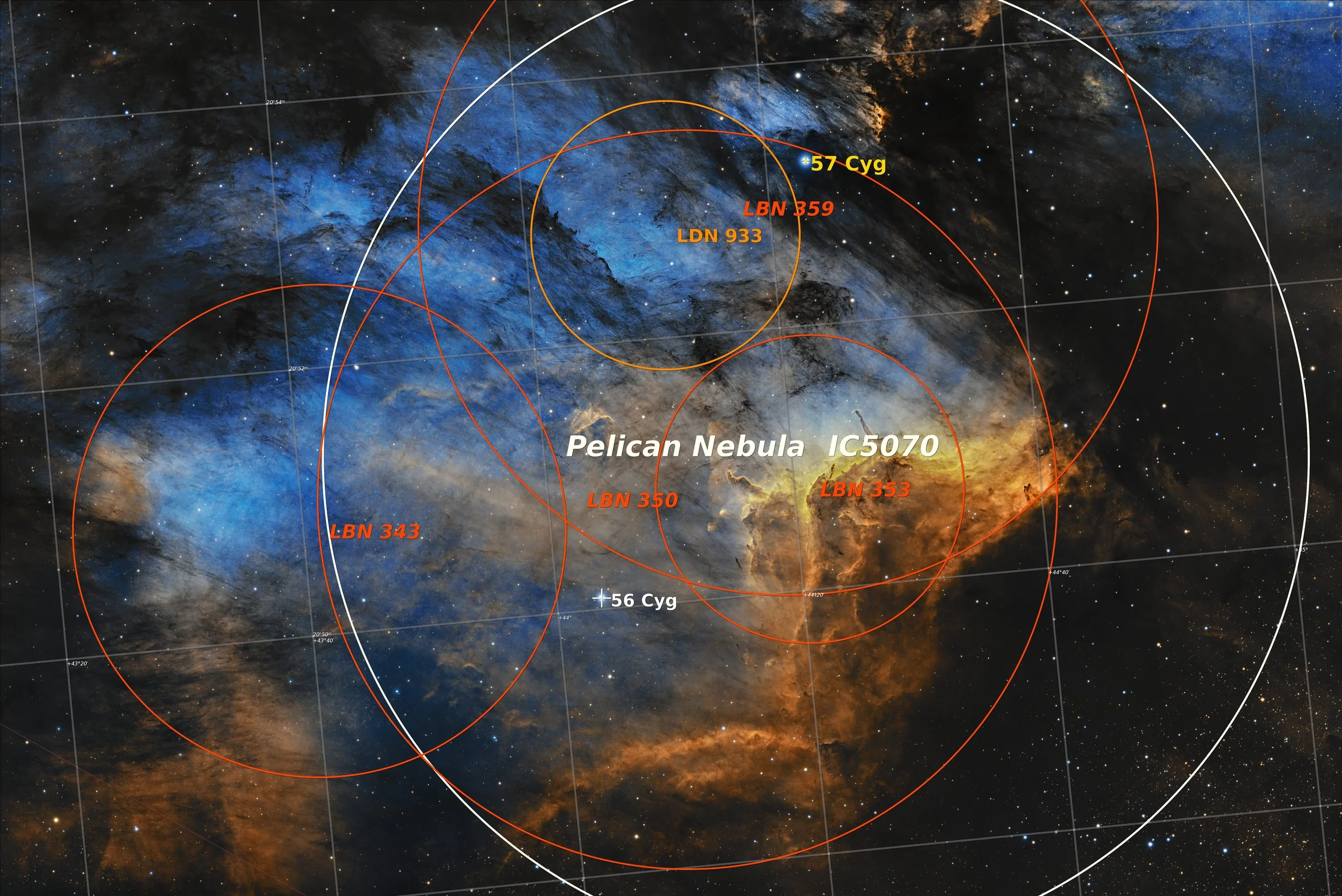 The Pelican Nebula (IC 5070) is a bright emission nebula found in the constellation of Cygnus. It is physically part of the same cloud complex as the North America Nebula (NGC 7000). A foreground dark cloud (Lynds Dark Nebula LDN 935) creates the visual gap between these two well-known targets.
